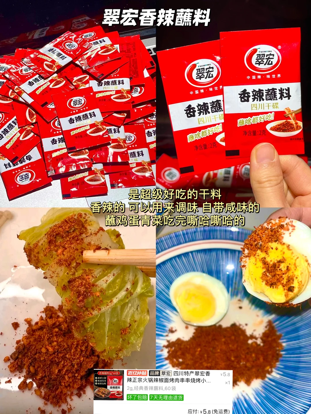 是超级好吃的干料,香辣的 可以用来凋味 自帯咸味的,蘸鸡蛋青菜吃完嘶哈嘶哈的!