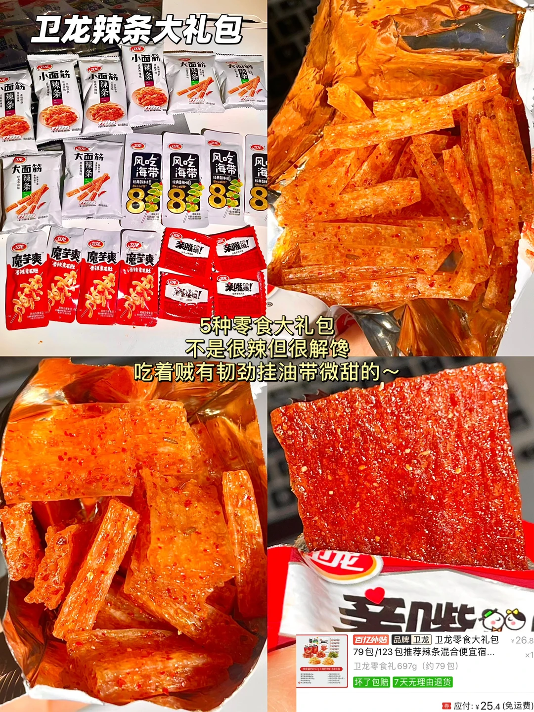 5种零食大礼包,不是很辣但很解馋,吃着贼有韧劲挂油带微甜的~