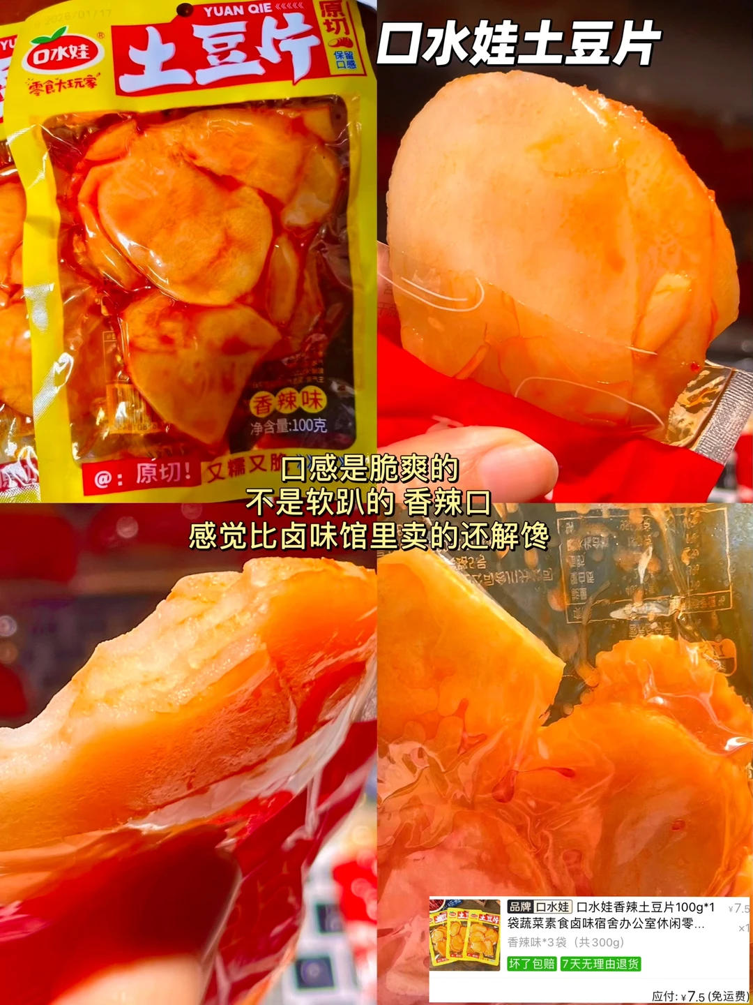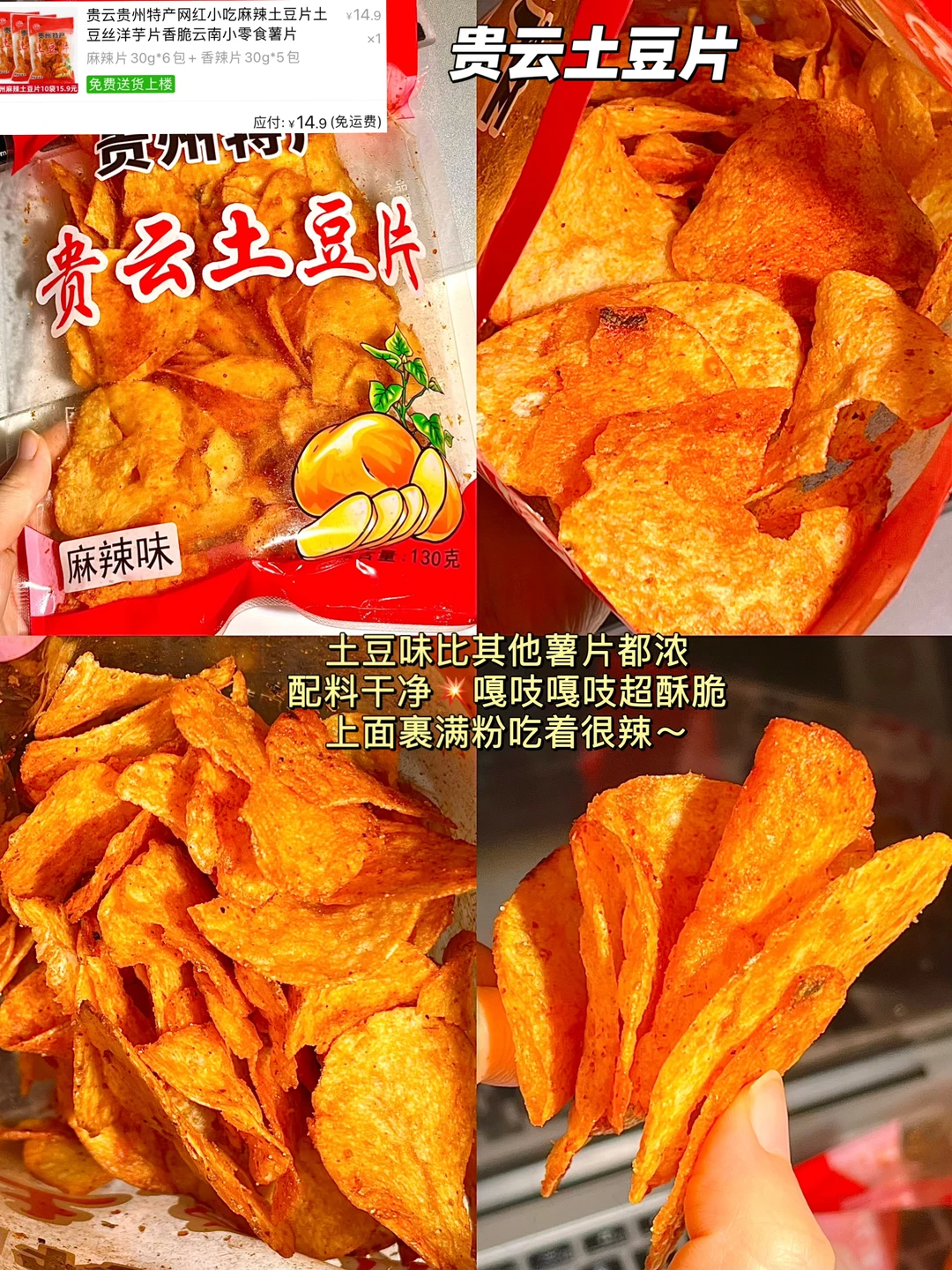 土豆味比其他薯片都浓,配料干净,嘎吱嘎吱超酥脆,上面裏满粉吃着很辣~