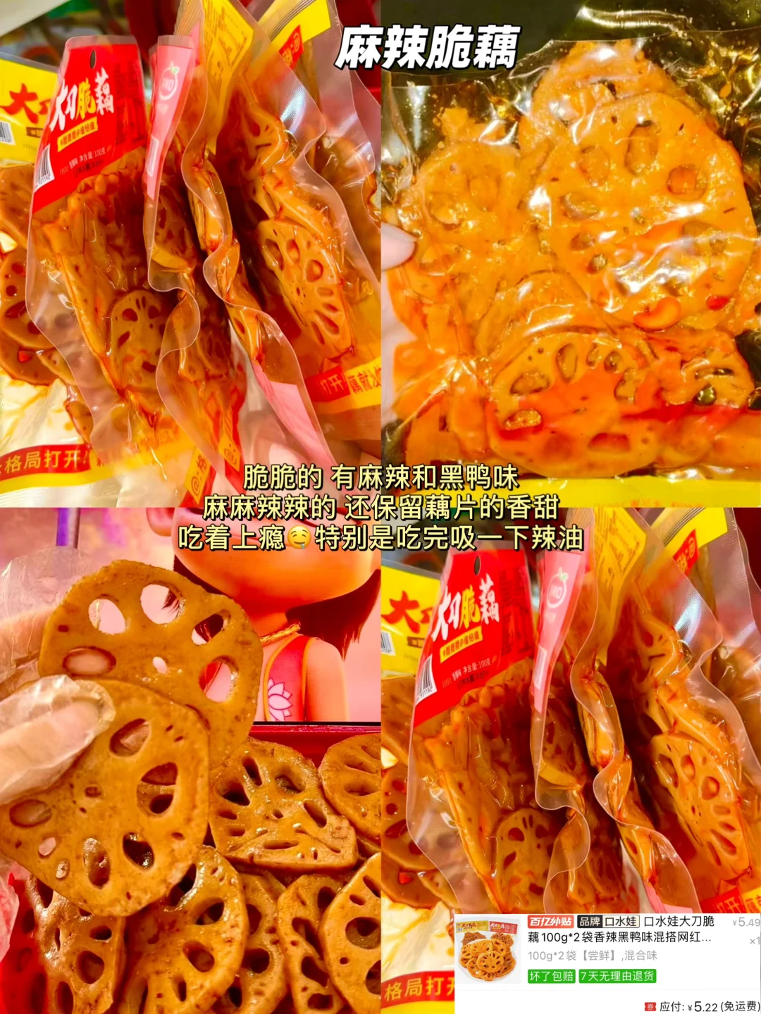 好脆啊 有麻辣和黑鸭味,还保留藕片的香甜,吃着上瘾~特别是吃完吸一下辣油!