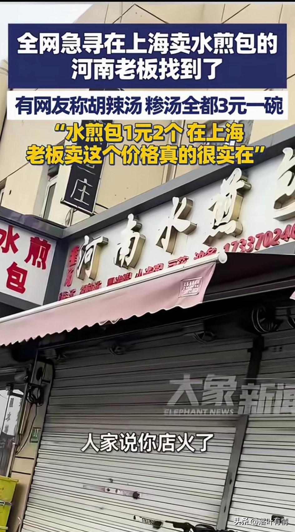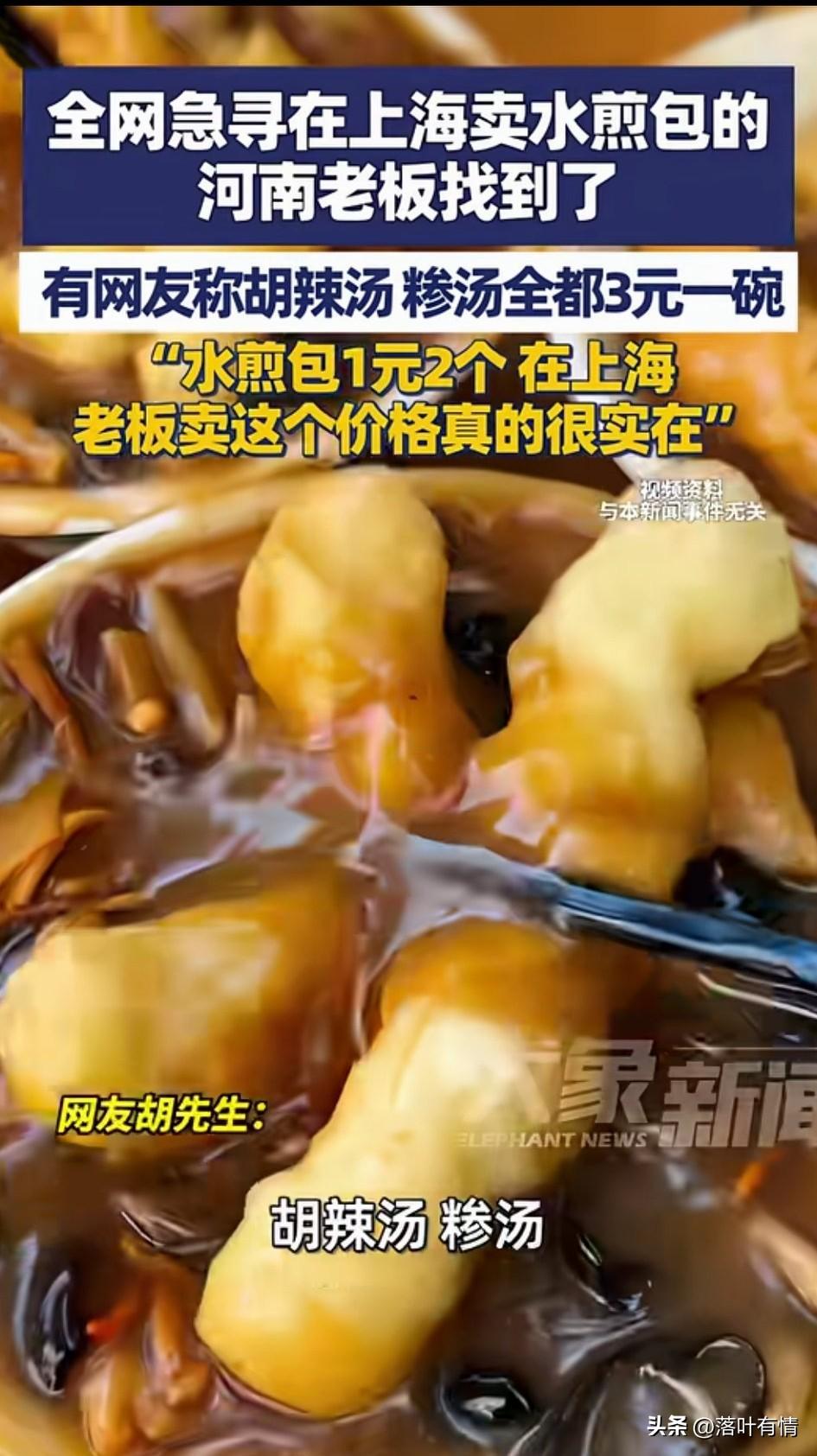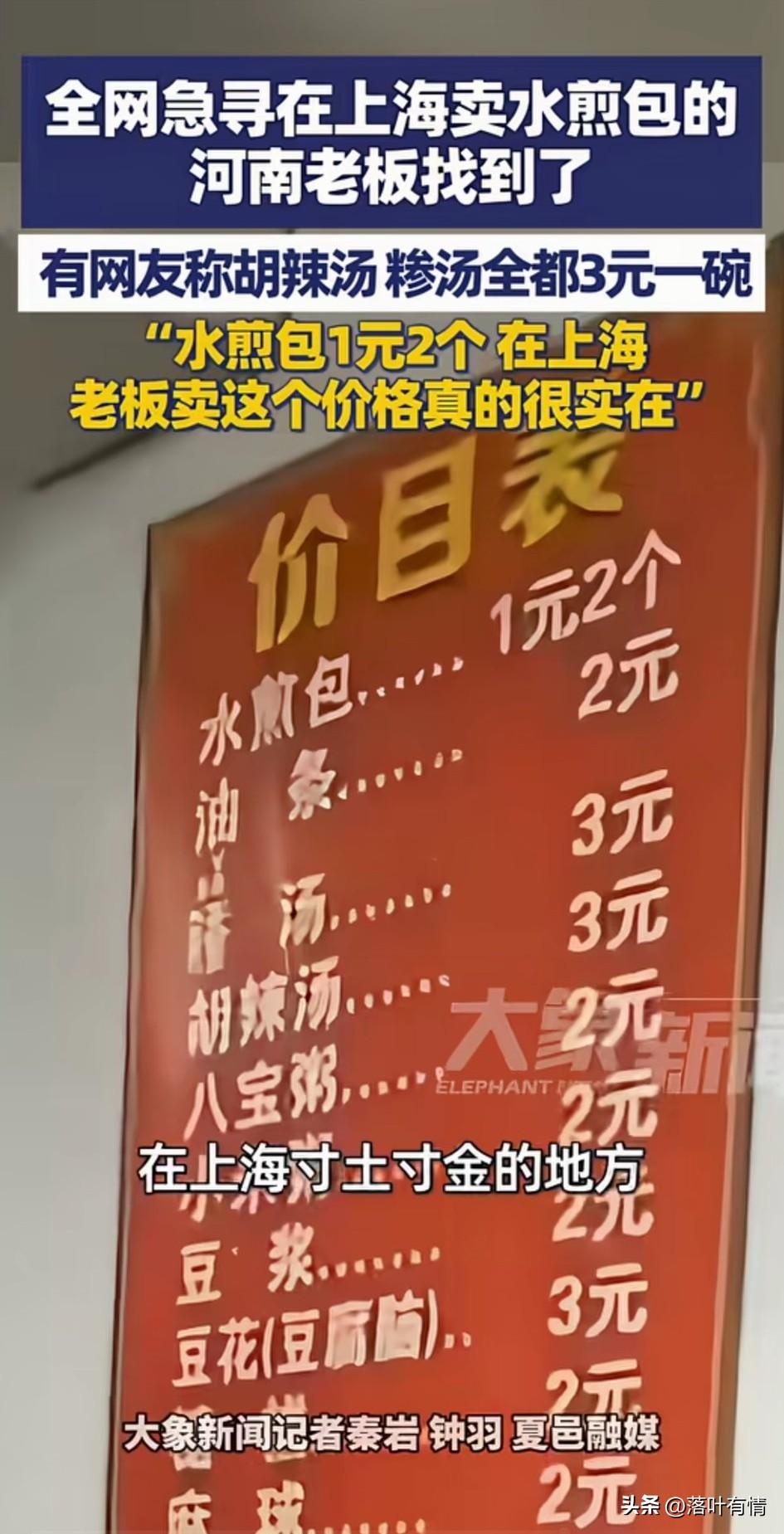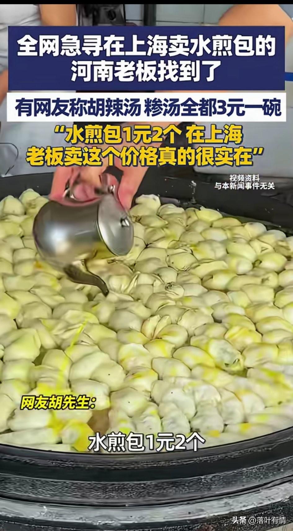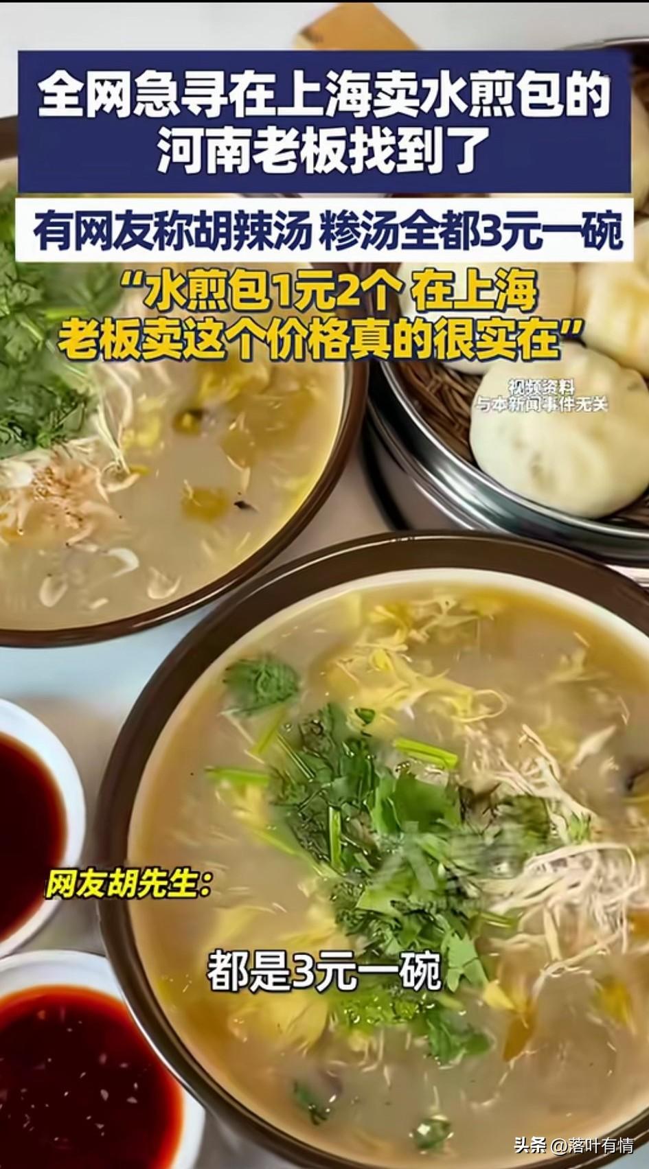 全网急寻在上海卖水煎包的河南老板被找到,他自己还不知道怎么回事, 直到有朋友给他打电话, 告诉他的店火了, 让他看新闻他才知道, 原来是他的客户在全网寻找他, 让他赶紧回上海开工, 有博主放出了他店里面吃饭的视频, 胡辣汤3元一碗, 水煎包1块钱两个, 八宝粥2元一碗, 油条2元一根, 这可是在上海寸土寸金的地方, 这物价简直不敢想象, 如今在很多地方都是这个价, 但是上海可不一样, 毕竟上海可是有自己的护币的, 在上海卖这样的价格简直就是良心, 毕竟房租水电真的太可怕了, 有记者采访了这位商丘夏邑的老板, 看老板面相就是非常憨厚的人, 老板表示自己干了两三年了, 生意还是不错, 都是周围的上班族和邻居, 很多网友看到了价目表, 都觉得这个老板太良心了, 纷纷喊话老板赶紧回上海开店吧! 要不然你的顾客就要饿死了! 大家对于在全网喊话让老板赶紧回去开店,这事怎么看? 上海 河南牛肉水煎包