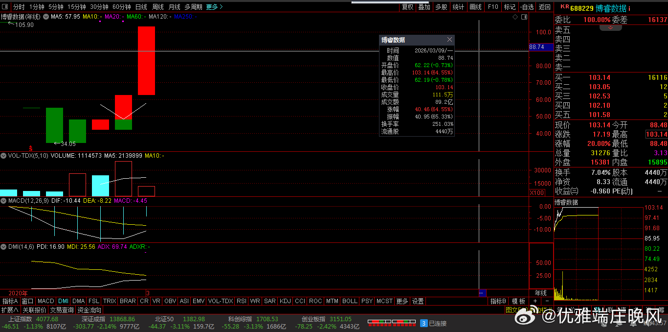 收盘价:103.14元。涨跌幅:20.008%。股票连涨:3天。