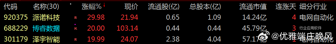 涨停龙头:惊艳今日:视野盘面:沪深北市:市场普跌:背景之下:派诺科技、博睿数据、泽宇智能三只个股逆势强势涨停,涨幅均接近或达到20%–30%上限。其中上涨;核心动因并非单一政策突发。而是源于:“算电协同”新基建政策预期等。欲知推手:下面透视涨停板龙头股票: