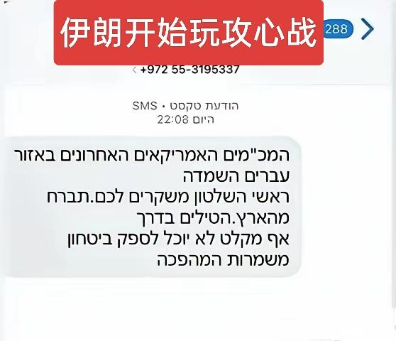 不知道是不是又听了网友的建议,伊朗开打攻心战了,他们给市民发送短信: המכ"מים האמריקאים האחרונים באזור עברים השמדה ראשי השלטון משקרים לכם.תברח מהארץ.הטילים בדרך אף מקלט לא יוכל לספק ביטחון משמרות המהפכה 大意是:最近在该地区的美国军队正在实施毁灭。政权首脑在欺骗你们。逃离这个国家吧。导弹正在路上,任何避难所都无法提供安全保障。 革命卫队 心理战再配合导弹的袭击,不知道效果会如何!