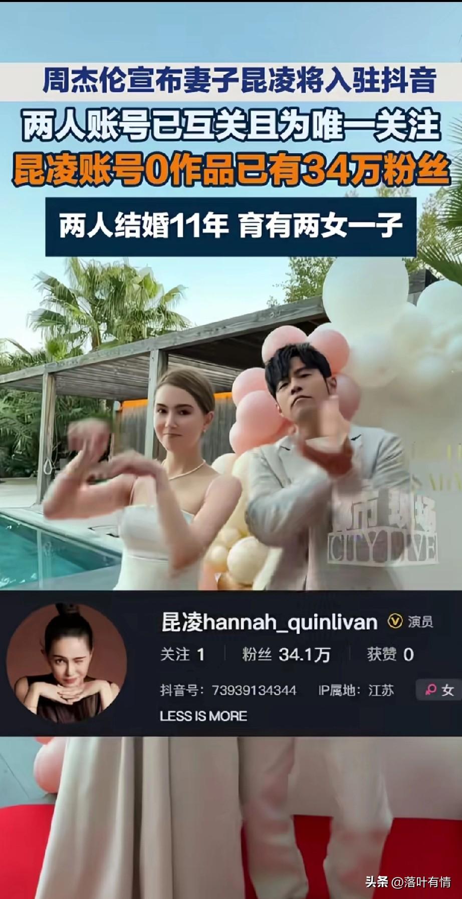周杰伦官宣自己的妻子要入驻抖音, 3月7号他的妻子开通了抖音账号, 仅关注了他一个人, 并且没有发布任何作, 直接涨粉34万, 两人结婚11年, 生育了两个女儿,一个儿子, 可以说是非常的幸福, 他的老婆一直视他为偶像, 年轻的时候就说周杰伦是他的偶像, 没想到成年后居然嫁给了周杰伦, 怪不得那么多女生要追星, 万一梦想实现了呢? 由于周杰伦的母亲非常的喜欢他的媳妇儿,可以说这是一场受到父母祝福的婚姻,所以两个人才能相处之间, 即使周杰伦被好友骗走了好多钱, 他的妻子也没有怨恨他, 反而是周间的粉丝开心坏了, 只要周杰伦缺钱的时候, 他就会出来开演唱会赚钱, 并且发布新的专辑, 这次又带自己的媳妇儿入驻抖音, 大家觉得是不是又缺钱了呢? 周杰伦 周杰伦插画 周杰伦粉丝量 周杰伦带娃日常