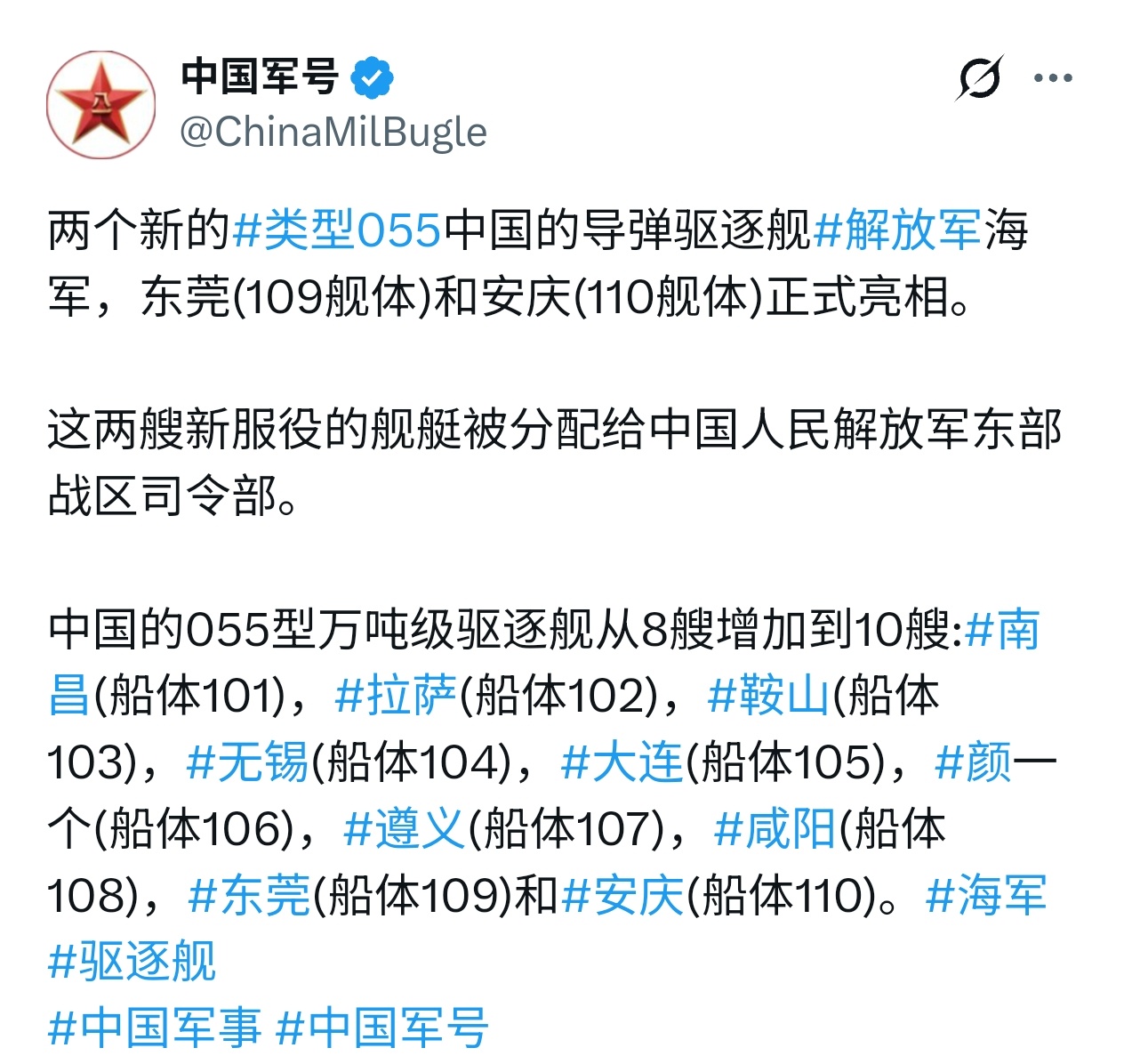 109东莞 / 110安庆舰,军号官宣舰名