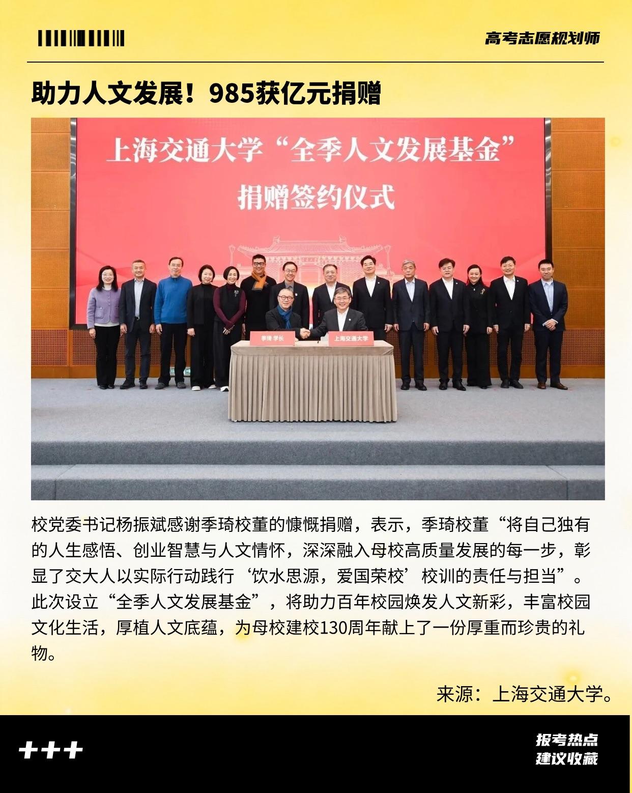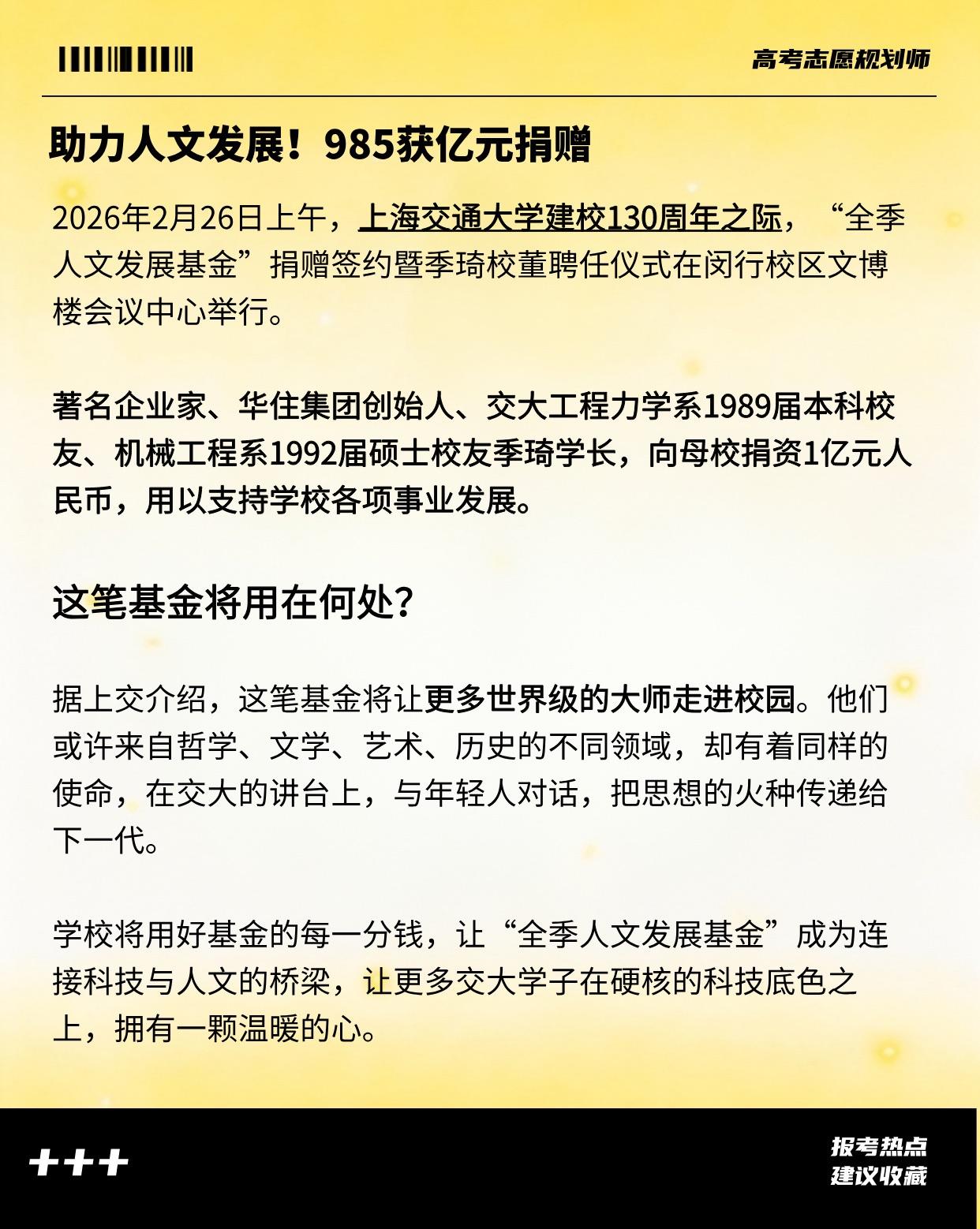 (2026 高考志愿填报知识分享) 近期热点 助力人文发展!985 高校 上海交通大学获亿元捐赠! 一亿元捐赠,这是✅母校最大的回报,相信有所成就的学子都乐意这么做,当然聘任程校董也是对这位学长最大的认可!