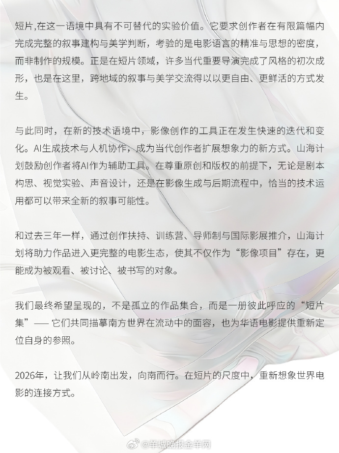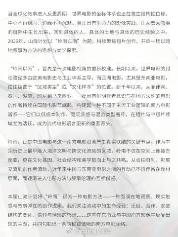 2026,我们诚邀青年导演从岭南出发,向更南而行,以短片重构世界电影的南方脉络。 第四届#山海计划##2026山海计划# 开启全球征募。沧海桑田,创作是唯一的坐标。🌍