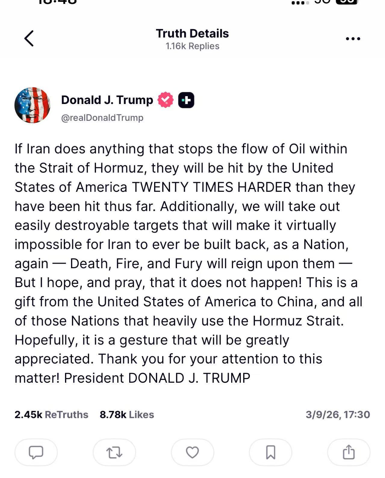 特朗普最新表态: “如果伊朗采取任何阻止石油在霍尔木兹海峡内流动的行动,他们将会遭受美国前所未有的打击,其力度将是迄今为止的20倍。此外,我们将摧毁那些易于摧毁的目标,这将使伊朗几乎不可能作为一个国家再次重建一-死亡、火焰和怒火将降临在他们身上一一但我希望并祈祷这一切不会发生!这是美国送给中国以及所有大量依赖霍尔木兹海峡的国家的一份礼物。希望这一举动能够得到极大的赞赏。感谢您对此事的关注!唐纳德·J·特朗普总统” 很有意思的。 1,又威胁伊朗,如果你怎样怎样,美国打击力度20倍。不知道这个倍数,究竟是怎么算出来的? 2,而且还祈祷,希望不会发生,说得好像很仁慈。那第一天就炸死170个伊朗小女孩,到底怎么回事? 3,更说成是送给中国等国的礼物,美国折腾出来的事情,还成了美国对世界的重大贡献,其他国家还得感恩戴德。不得不佩服,特朗普真会说啊[笑哭]