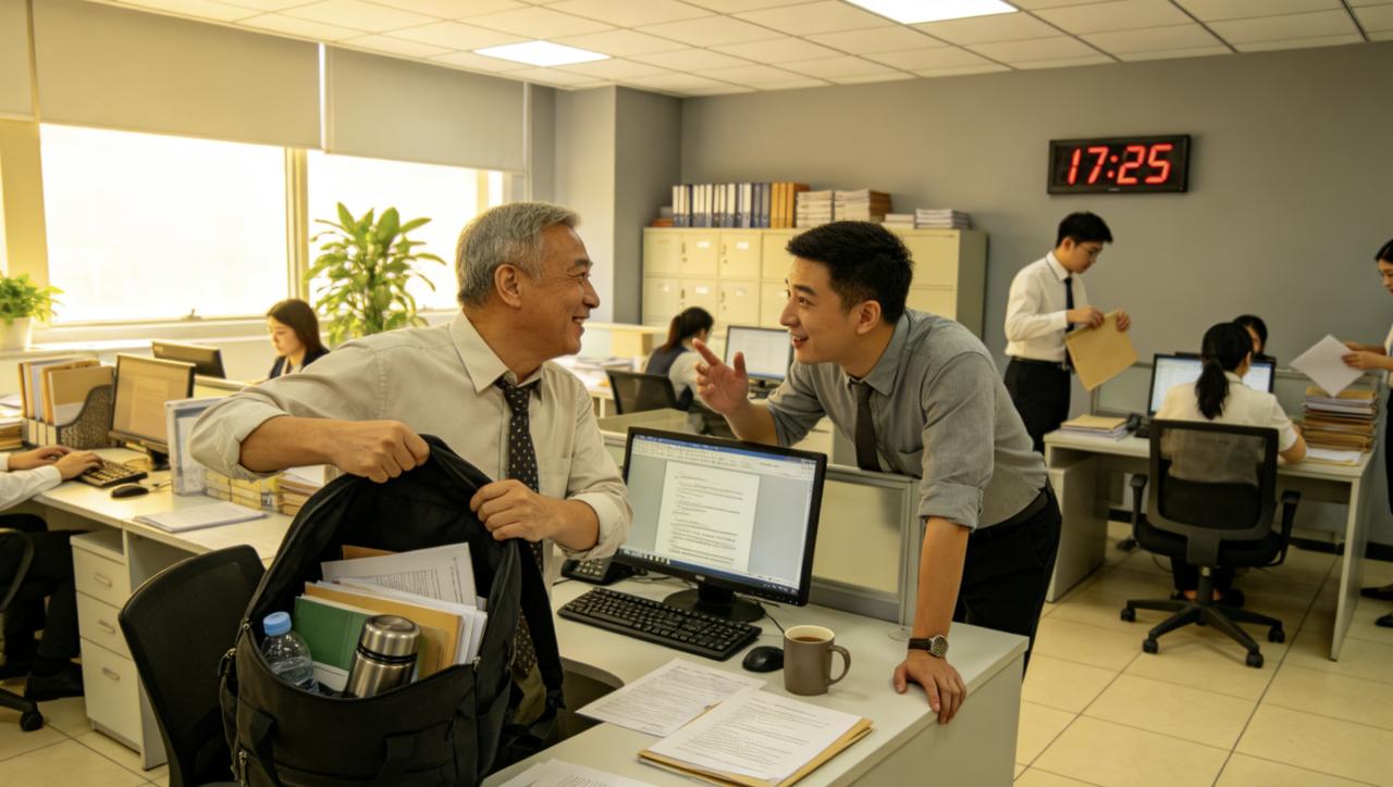周五下午五点二十五,老张开始收拾包。 隔壁小王探过头:“张哥,急着走啊?” 老张手没停:“今天周五,到点了。” 小王笑:“领导还没走呢。” 老张愣了一下,把包放回桌上,打开电脑,继续看报表。 六点半,领导办公室灯灭了。老张站起身,拎包离开。 电梯里碰见保安,保安问:“张工今天加班啊?” 老张摇摇头,没说话。 出了门才发现下雨了,没带伞。他站在门廊底下等雨小,掏出手机刷朋友圈。 刷到小王一小时前发的照片:工位空着,配文“周五准时下班,享受生活”。 老张点了个赞,把手机揣回兜里。 雨还在下。