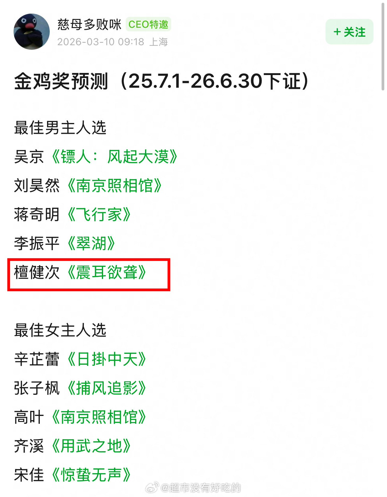 网友预测金鸡奖入围提名演员男演员人选提名了檀健次《震耳欲聋》