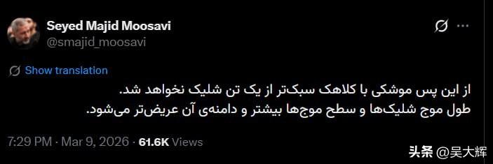 伊朗伊斯兰革命卫队空天部队司令穆萨维宣布,伊朗今后将只使用弹头重量1吨及以上的重型导弹打击目标。 “从现在起,不会再发射任何弹头重量低于1吨的导弹。打击间隔将会拉长,但打击的规模和威力将大幅增强。”