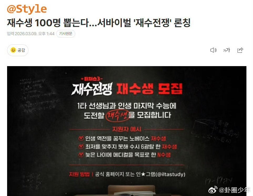 韩国要拍高考复读综艺100名高考复读生将通过多轮竞争决出优胜者,韩国综艺再次聚焦现实议题,话题度持续走高。