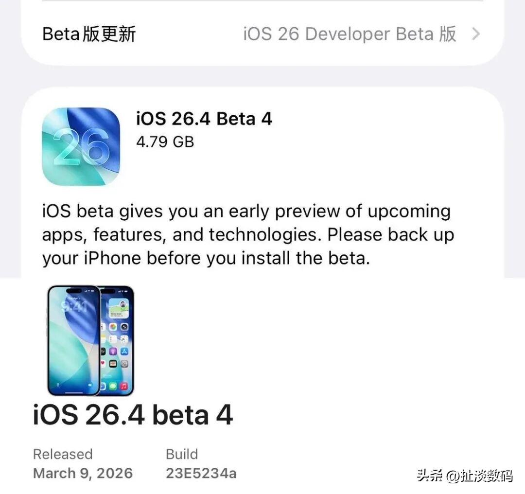 iOS 26.4 新系统更新! 可让人失望透顶,7个表情包、一个开关(减弱明暗效果开关)、一个取消(取消原来显示高亮效果选项)提升视觉舒适度、一个新增(新增短信功能加密显示提醒)、一个强化(强化通信安全)、其他,还是万年不变的进一步提升系统稳定性;简简单单就完成一次升级,真是越来越搞不懂苹果了,苹果工程师这薪水领的也太不容易了[捂脸]。 今日凌晨,苹果向开发者推送了iOS 26.4 Beta 4 测试版,版本号为:23E5234a,同步更新的还有 iPadOS、macOS、watchOS、tvOS、visionOS 全平台对应版本,可惜,看了上面的更新内容,让人失望透顶啊!不痛不痒,简简单单、平平淡淡的,不知道,您们对苹果的系统更新,还有什么期待?