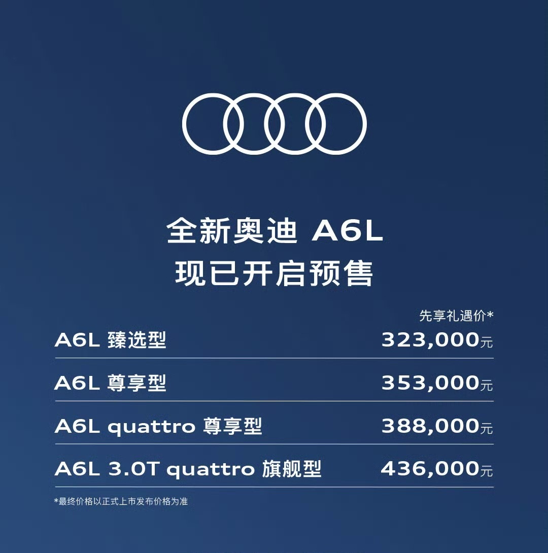 全新奥迪A6L全新A6L预售价32.3万起顶配3.0T Quattro 43.6万去年朋友新提的45 Quattro32.6万