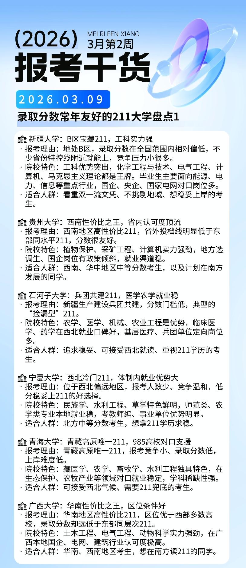 【高考志愿填报知识解读】录取分数常年友好的211大学盘点。很多家长以为211分数都比较高,其实有很多211院校的录取分数还不如一些非211高校,当然这其中大部分是因为地域或者院校性质导致的!所以填报志愿的时候要多方面考虑,别一味的看分数或者看院校属性!