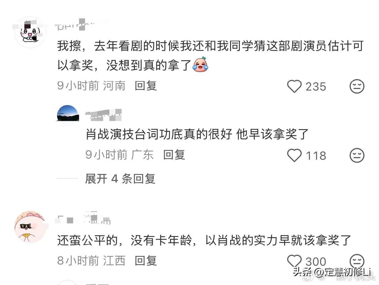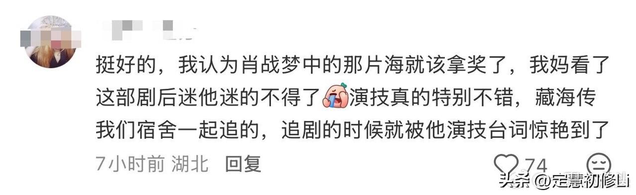 肖战当演员拿到的第一个大奖,SMG视帝,孙俪拿到视后,但是不管路人观众还是营销号业内,大家都觉得肖战早就该拿奖了,这次凭借藏海获奖,当之无愧,实至名归[赞][赞]这就是演员有好作品的口碑和底气,无一人质疑肖战藏海的演技和同期声台词,这才是演员的骄傲,凭真实力,凭真大爆作品,凭真大爆角色,才能赢得观众真正的夸赞和肯定