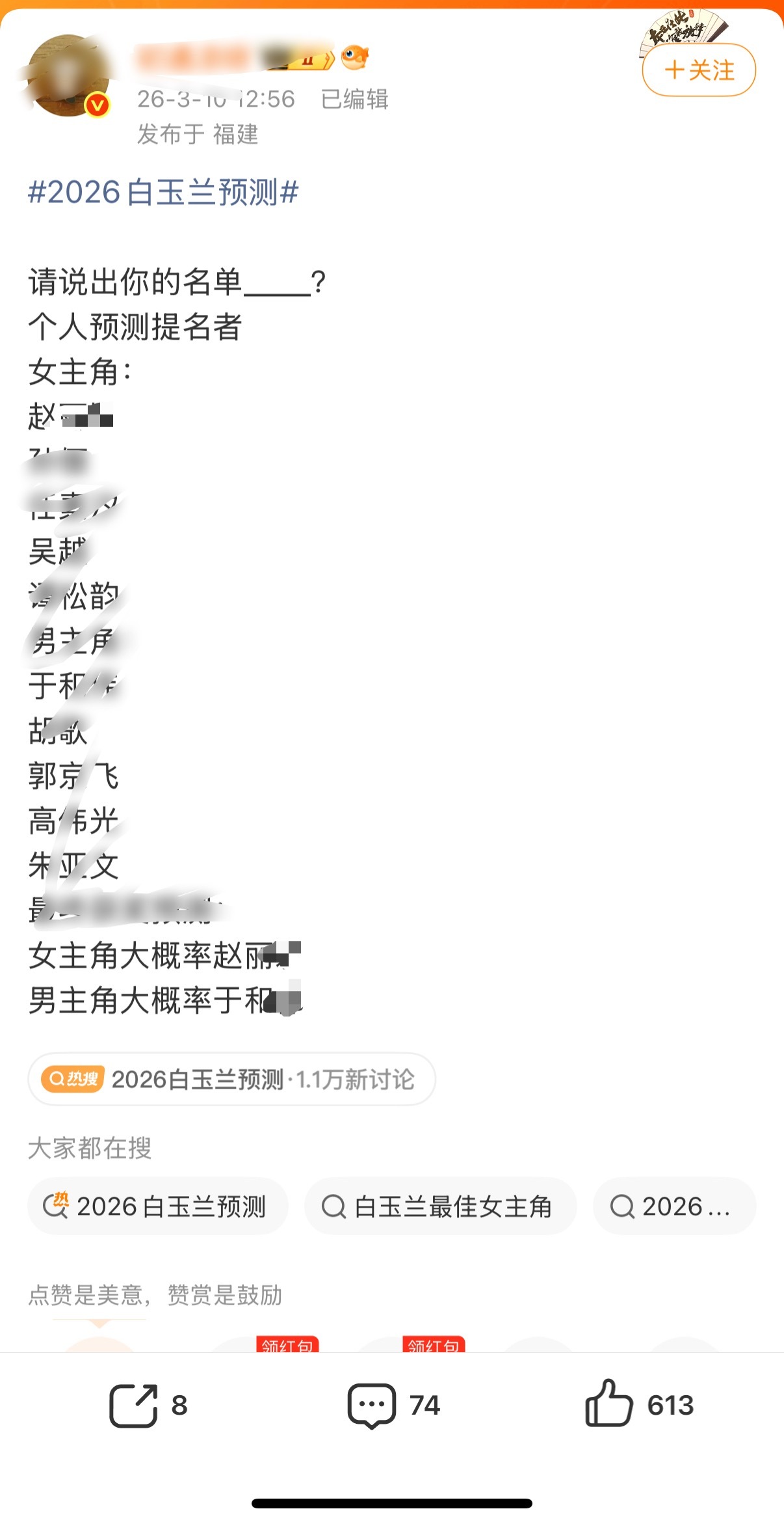 2026白玉兰预测水城的收视率云合演技有生万物的零头吗,就敢说自己是白玉兰最佳女主,能入围吗,水城这种烂剧入围那才是笑话,就当看个笑话就行