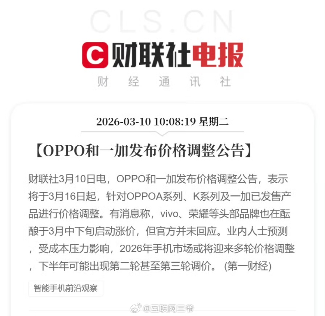 OPPO涨价上游的影响挺大的,第一家宣布涨价的,其他家应该陆续也要宣布涨价策略了 手机市场将迎来全面涨价
