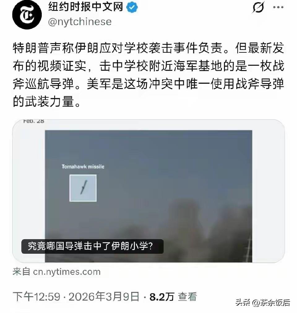 视频证实伊朗学校被“战斧”导弹击中,可特朗普仍坚称伊朗应对学校袭击事件负责,连纽约时报都看不下去了,专门发文揭露事实!可是特朗普仍在“甩锅”,竟然谎称伊朗也有“战斧”:“战斧”导弹在其他国家也有销售和使用,不管是伊朗——他们也有几枚“战斧”,还想拥有更多。事实上,“战斧”具体卖给了谁?特朗普可能知道,也可能不知道,但是这种武器出口是严格控制的,起码不会卖给伊朗,这是特朗普肯定知道的。可是,为了否认屠杀女童,掩盖战争罪行,特朗普无视确凿证据,妄图混淆视听、推卸罪责!其实,国际社会对此看得清清楚楚!