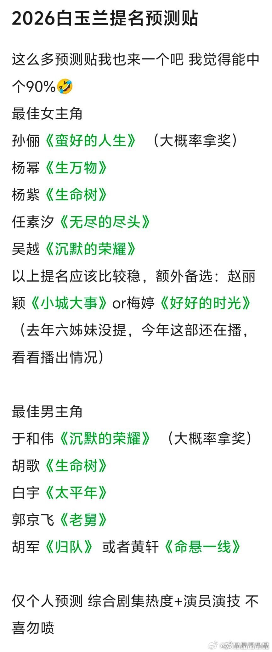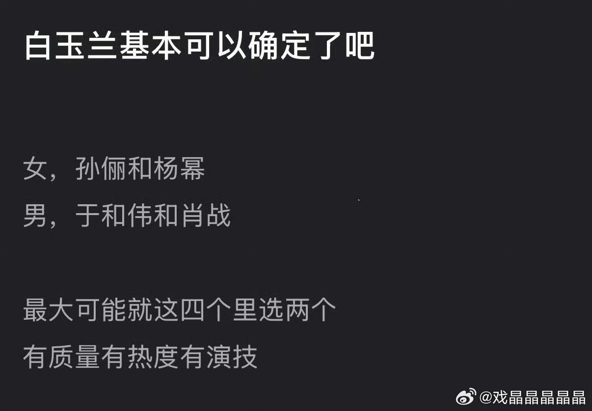 2026白玉兰预测从以往数据来看,孙俪得白玉兰视后概率最大,因为她拿了总台视后和上海文广视后,白玉兰视帝概率最高的就是于和伟和肖战,于和伟有总台视帝,肖战有上海文广视帝和总台视帝提名。