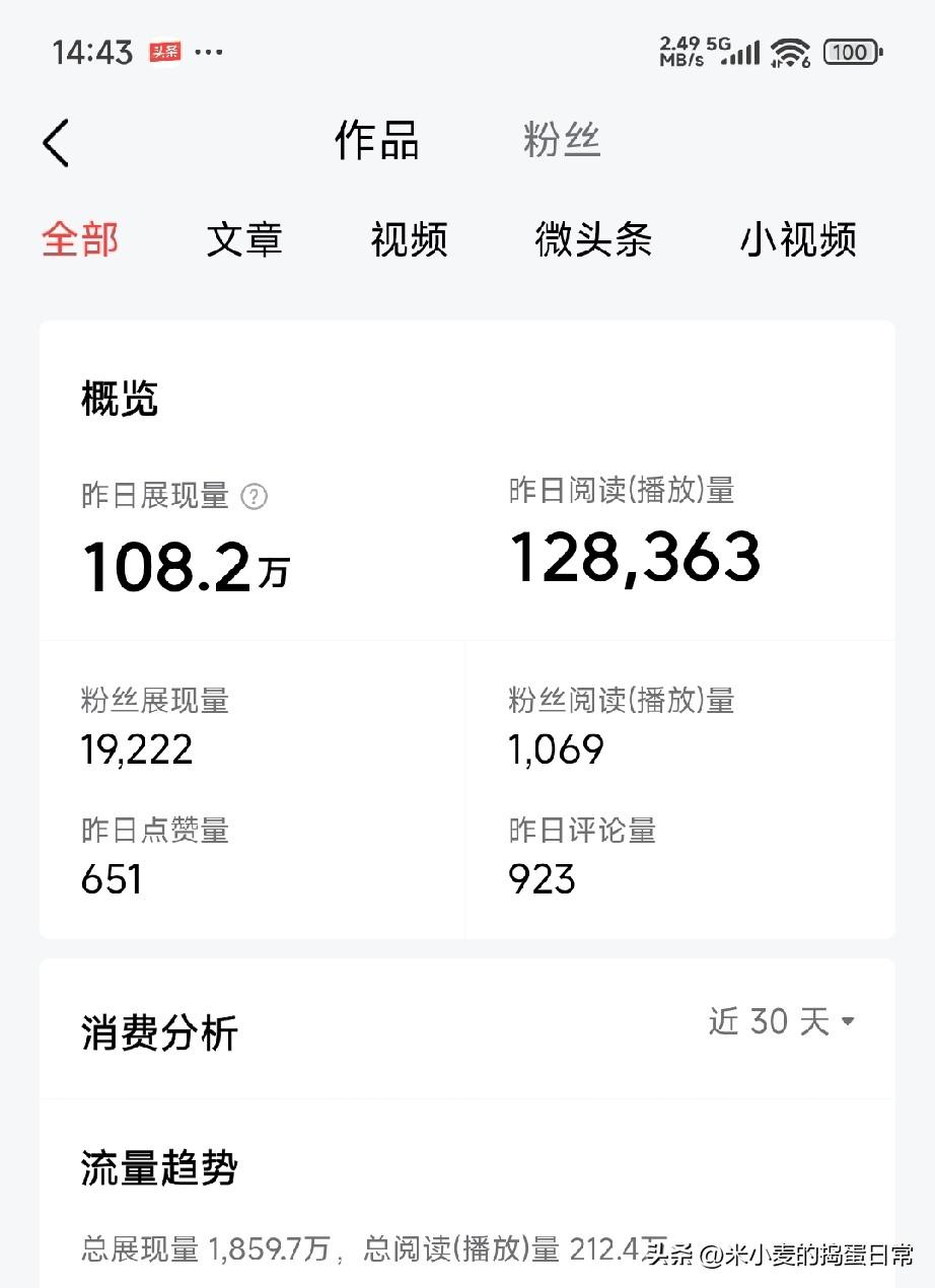头条破局真相:我凭108万展现量悟透的流量密码 别再抱怨头条没流量了!昨天后台弹出的108万展现量,彻底打醒了还在躺平的我。 作为普通素人,没有大咖的自带光环,也做不到随手发图就爆火。曾经我的作品也石沉大海,直到我放下“高冷”,死磕互动这一步。 每天把刷到的优质内容认真点赞、走心评论,不是敷衍的“不错”,而是聊观点、谈感受。慢慢的,互动区有了回音,账号权重也悄悄涨了。 但切记,互动只是敲门砖!想要持续爆款,内容才是核心。抓民生热点、写大众共鸣,拒绝流水账,每篇都戳中大家的心里话。 别妄想发完就躺赢,头条从不辜负勤奋的人。友友们,流量低迷时,先动起来,再磨内容,99+的消息提醒,真的没那么难!