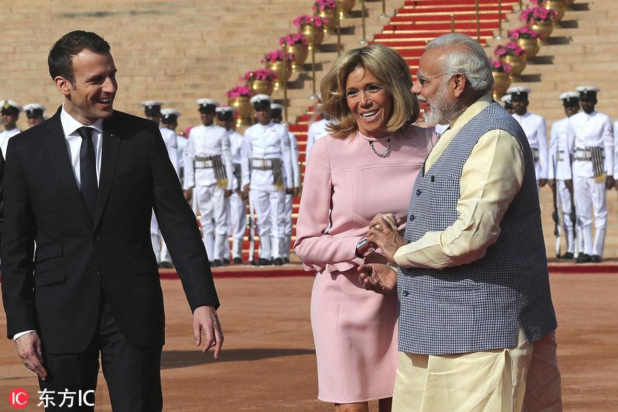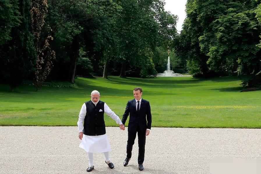 莫迪和马克龙手拉手,拥抱的两人看起来是忘年交呀。马克龙的妻子和莫迪手指相扣笑得很开心,马克龙的朋友也是她的朋友。