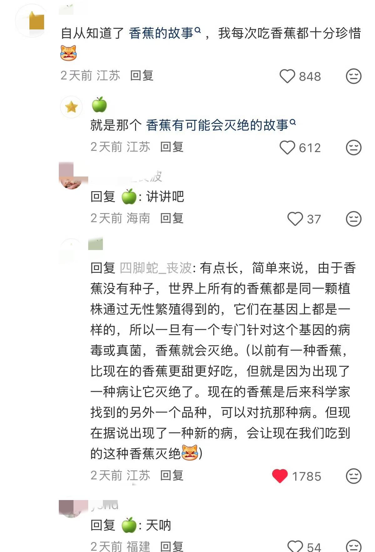 紧急!你天天吃的香蕉,正在遭遇“灭顶之灾”!水果自由要没了? 香蕉有可能会灭绝 冲上热搜,很多人以为是噱头,看完真相真的慌了! 不是所有香蕉都灭绝,而是我们超市里95%的华蕉(卡文迪什),正在被一种叫TR4的真菌“追杀”。这种病被称为香蕉癌症,藏在土里能活几十年,无药可解,一染全死。 更要命的是,华蕉全是无性繁殖,全球香蕉基因几乎一模一样,相当于全世界种同一棵树,一个弱点就能团灭整个品种。 历史早有前车之鉴:上世纪风靡全球的大麦克香蕉,就是因为同样的原因彻底灭绝,我们才吃上现在的华蕉。如今悲剧重演,华蕉防线节节败退,全球主产区接连沦陷。 以后不是没香蕉吃,而是吃不到现在这种香甜、好剥、便宜的香蕉了!想想早餐配香蕉、甜品加香蕉、宝宝辅食靠香蕉,真要没了,多少人的快乐直接减半? 好消息是,科学家正在拼命育种攻关,相信科技能守住我们的水果自由! 你平时爱吃香蕉吗?最怕以后吃不到现在的口味吗?评论区聊聊,一起为香蕉加油!🍌