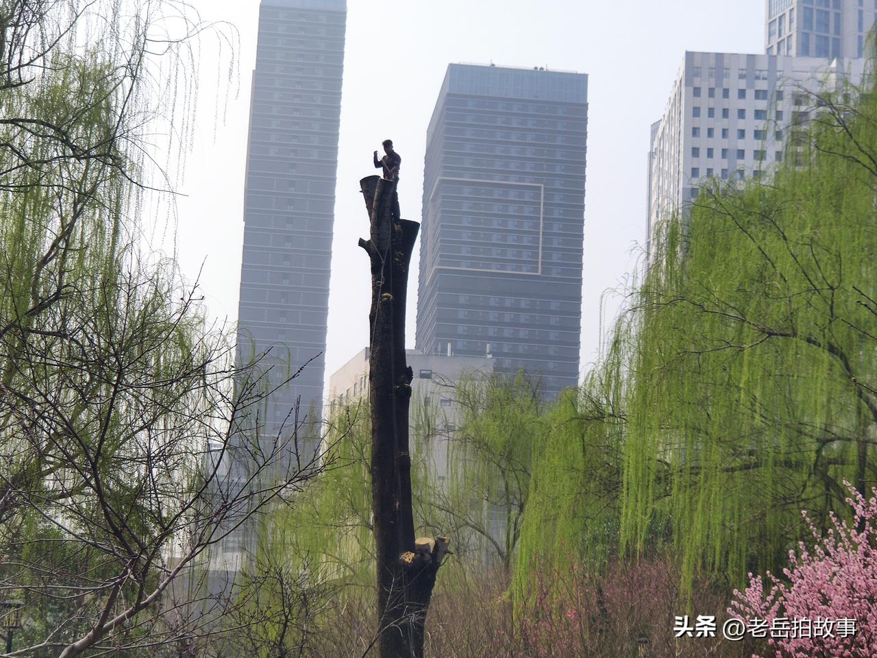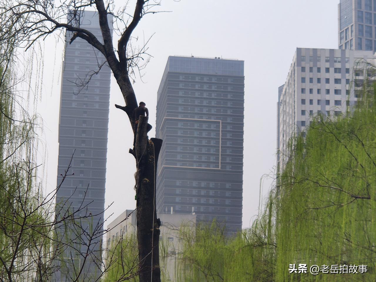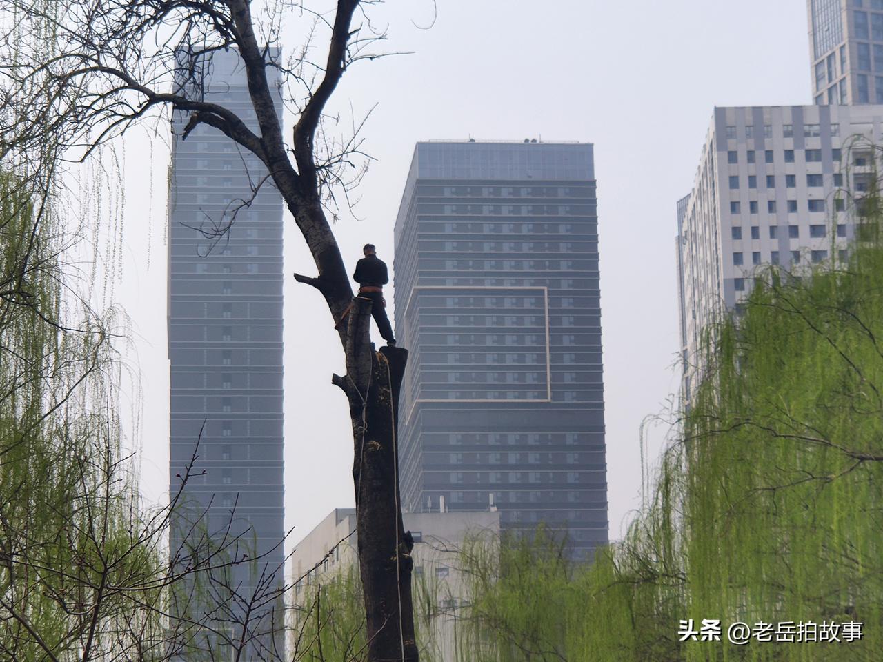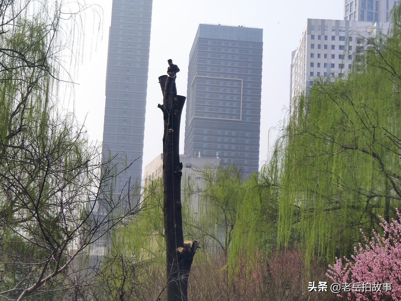 树高人为峰!今天上午去郑州市人民公园遛弯,看到几位师傅们在给一棵参天大树“理发”,大树的周围被人用警戒线圈了起来,各个路口也有人把守,禁止靠近,树上一位老师儿在什么拿着油锯一阵忙活,脸盆粗的树枝随着一声声树枝撞击地面的巨响应声落地,不到一袋烟的功夫,大树便成了秃头。现场有人说,这是为了防止大风天气刮断树枝伤人而采取的预防措施。