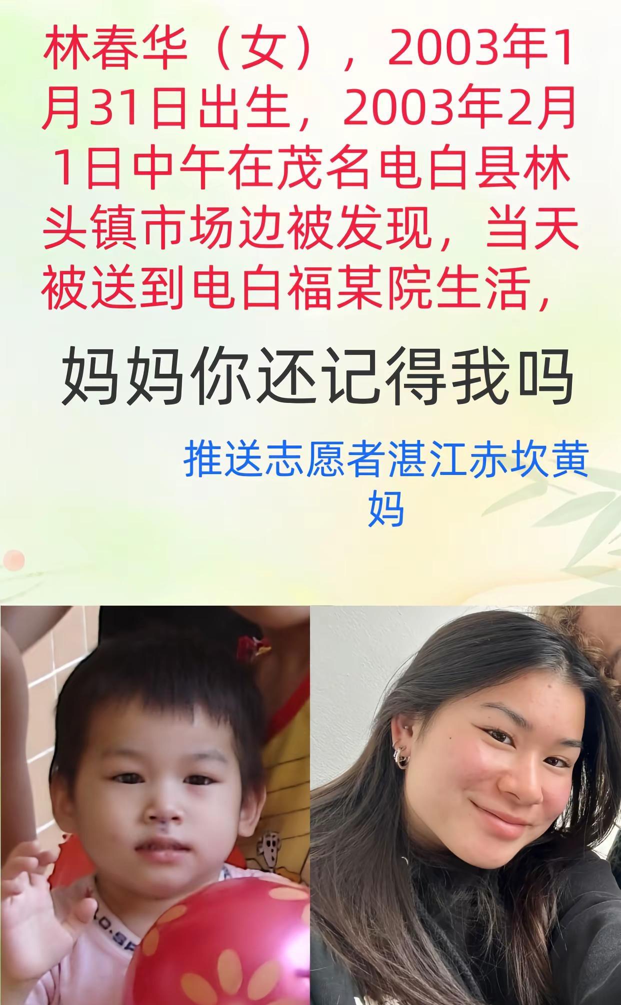 673136姓名:林春华性别:女出生日期:2003-01-31失踪时身高:未知CM失踪时间:2003-02-01失踪地点:广东省,茂名市,电白区,林头镇市场边失踪者特征描述:无特殊胎记疤痕其他资料:林春华(女),2003年1月31日出生,2003年2月1日中午在电白县林头菜市场傍边发现,2003年2月1日送到电白某院出处:宝贝回家论坛寻人启事求好心人帮忙