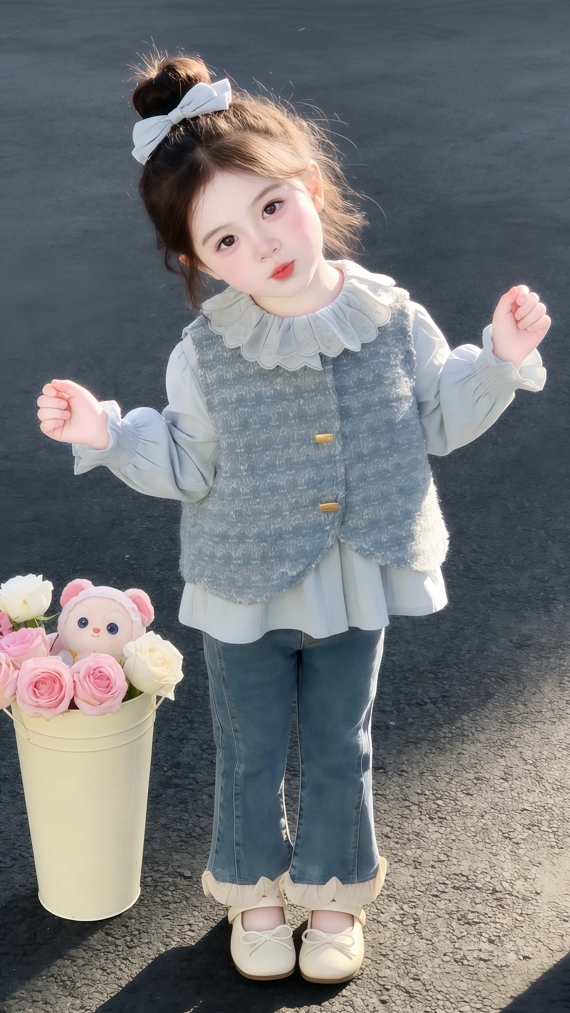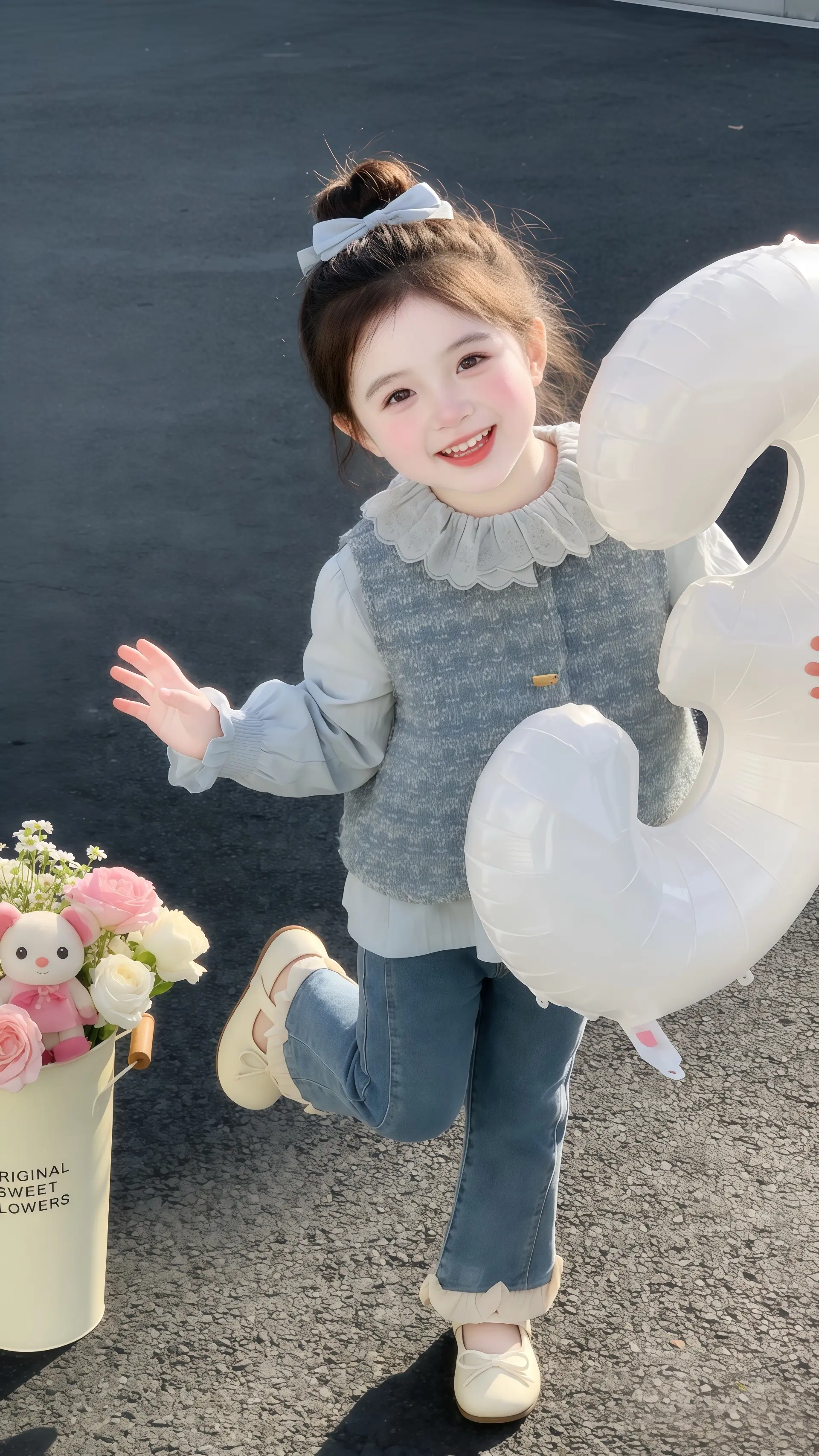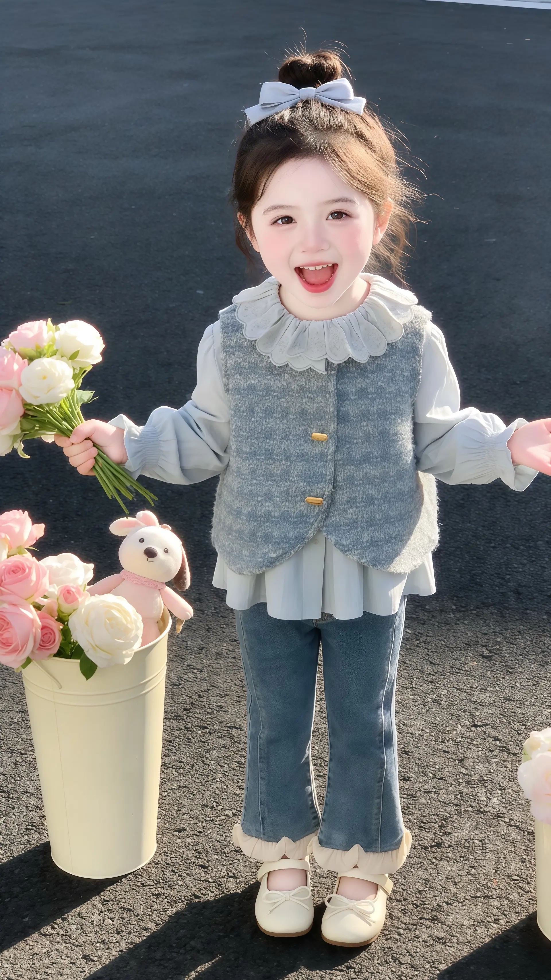 娃弯着腰笑开花,灰开衫软乎乎像“裹了片薄雾”,粉纱裙晃起来像“盛着团樱...