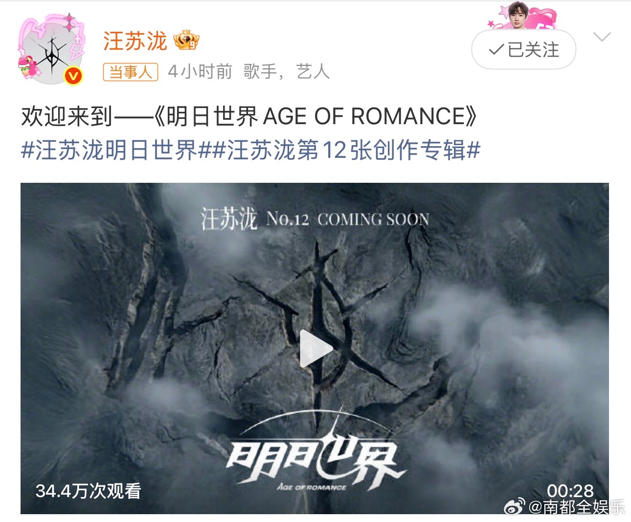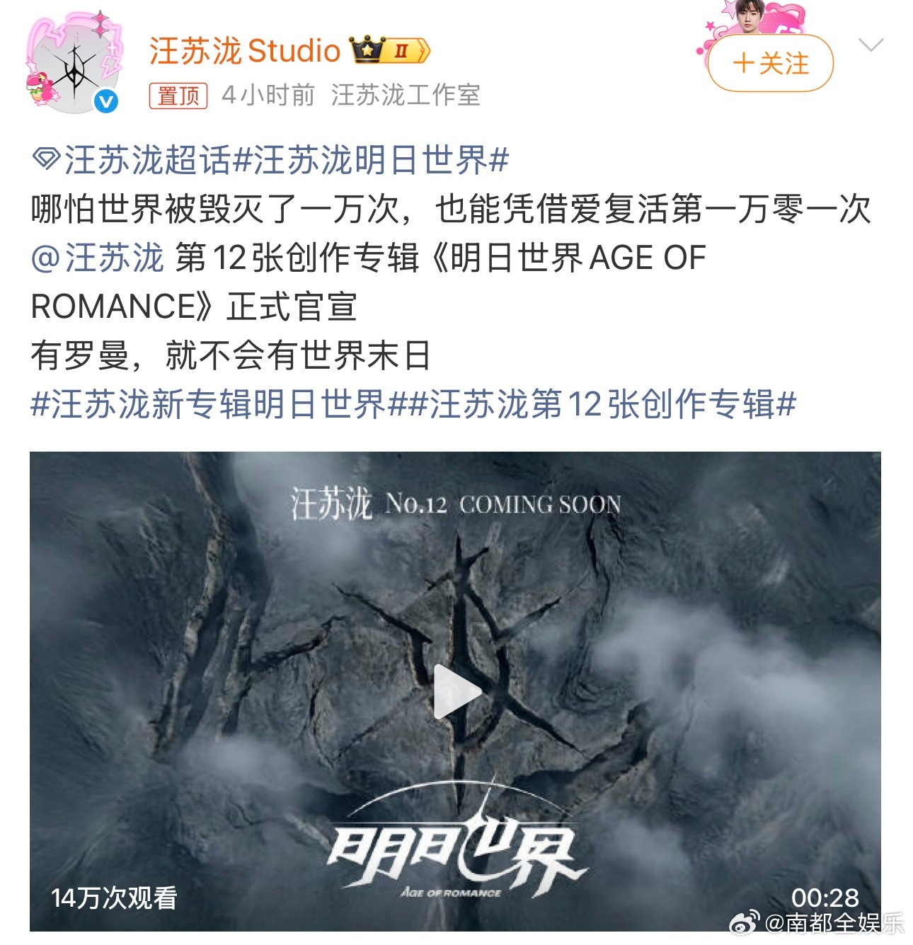 汪苏泷新专辑明日世界纽约偶遇汪苏泷今日,汪苏泷官宣第12张新专辑——《明日世界AGE OF ROMANCE》,“有罗曼,就不会有世界末日哪怕世界被毁灭了一万次,也能凭借爱复活第一万零一次。”新专辑引发期待外,还有网友晒出在纽约偶遇汪苏泷的照片,称汪苏泷应该是在拍摄新专辑MV或者宣传视频。路透很帅,期待新专辑和新巡演!(图源网络)