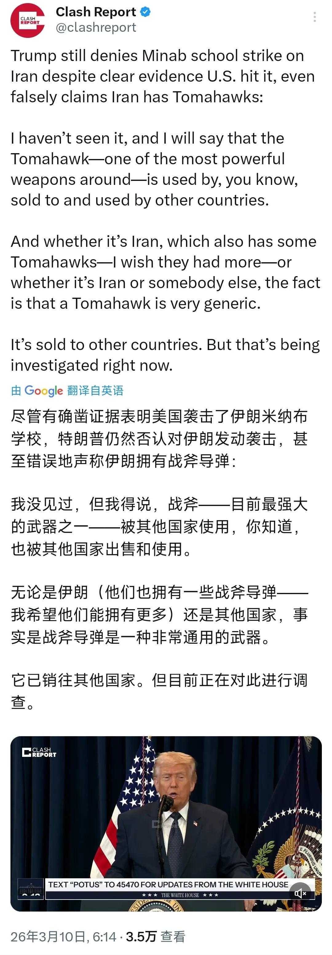 尽管有确凿证据表明美国袭击了伊朗米纳布女子学校,造成175名女生死亡,但特朗普今天(3月10日)接受采访时仍然否认对伊朗发动袭击,甚至错误地声称伊朗拥有战斧导弹:“我没见过,但我得说,战斧是目前最强大的武器之一,也被其他国家所使用。无论是伊朗(他们也拥有一些战斧导弹,我希望他们拥有更多)还是其他国家,事实上战斧导弹是一种非常通用的武器。它已被销往其他国家。不过这事正在对此进行调查中。” 当前不仅有视频而且也有美战争部发布的轰炸地图,都证明了是美国使用战斧导弹袭击了伊朗米纳布女子学校,酿成了175名女生死亡的悲剧,但特朗普依然在百般抵赖,声称伊朗也拥有战斧导弹。该型导弹使用舰艇发射,直到2024年年初,美国洛克希德.马丁公司才研制成功陆基发射系统并交付美军,而且仅有两套,其中一套参加过菲律宾、日本的军事演习。美国何时向伊朗销售过战斧导弹?伊朗又用何种载具能够发射战斧导弹?特朗普满嘴荒唐言。
