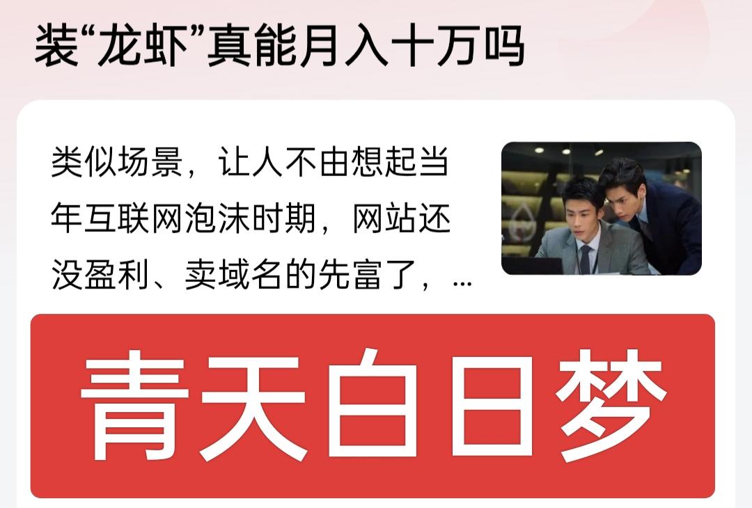 养龙虾现在异常火热,好像养龙虾什么都能干似的,相当于请了一个24小时持续工作的员工,装龙虾也成了热门职业,真的能月入10万吗? 姑且就算有,按500元每单计算,月入10万 需要200单,那么每天需要安装7单左右,可能吗?再说了,如果真的那么赚钱,这种消息能传出来吗?这年头赚钱的谁不是闷头干,谁会分享出来呢? 让子弹再飞一会儿,千万别相信躺赚宣传,如果你信了,可能就成了被收割的对象。