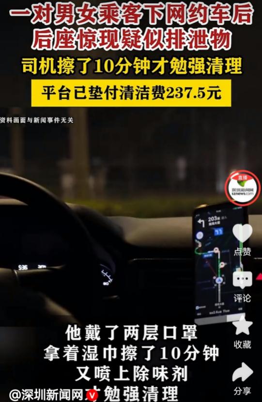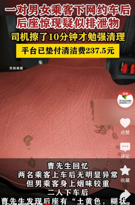 [中国赞]3月7日,天津,网约车司机送完一对年轻男女后,往后座一看,竟发现后排坐垫上糊着一堆土黄色,稀稀的东西,看着就像人的排泄物。司机恶心的不得了,戴了两层口罩才收拾干净。恶心之余他觉得特别气愤,年轻人看着光鲜亮丽,怎么素质这么低,能干出这种事。于是,他联系平台要求赔偿,但平台的回复让他无语。 (信源:信网——网约车后座发现疑似排泄物 司机怀疑是一对男女乘客所为) 元宵节深夜的天津街头,烟火气还未散尽,兼职网约车司机曹先生的心情,却在送完最后一单后瞬间坠入冰窖。 他驱车前往充电站,车内阅读灯自动亮起的瞬间,后座坐垫上一片土黄色的稀状污物,像一记闷棍砸过来,让他胃里翻江倒海。那团酷似人排泄物的污渍,在灯光下格外刺眼,也成了他这个元宵夜最不堪的记忆。 这单生意来得寻常。深夜十点多,曹先生接上一对年轻男女,男乘客身上带着浓烈的烟味,全程没什么交流,十几分钟的车程很快结束。 两人下车时行色匆匆,没有一句多余的话,更没提过车内有任何异常。曹先生当时只当是普通乘客,万万没想到,这份“寻常”背后,藏着如此让人膈应的状况。 强忍着恶心,曹先生从后备箱翻出备用口罩,一口气戴了两层,又找来湿巾和除味剂,蹲在后座开始清理。 粘稠的污渍牢牢粘在坐垫上,他擦了又擦,反复喷了好几遍除味剂,足足忙活了十几分钟,才勉强把肉眼可见的污迹清理干净。初春的深夜寒气逼人,他却累得满头大汗,不仅身体疲惫,心里的火气更是越烧越旺。 作为兼职司机,曹先生跑网约车只是为了补贴家用,第二天一早他还要出差,根本没时间和精力纠缠琐事。他第一时间想到联系平台,希望能帮忙联系乘客讨个说法,同时承担清洁费用。可平台客服的回应,却让他的怒火又添了几分。 面对他的诉求,客服态度冷漠,没有一句安抚,只丢下一句“建议自行报警处理”,便没了下文。 报警?曹先生心里犯了难。他很清楚,报警意味着要做笔录、配合调查,这一套流程走下来,半天时间都不够。他第二天的出差行程早已确定,根本抽不出时间耗在警局。 无奈之下,他只能整理好所有证据,包括行车记录仪视频、行程记录和现场照片,再次向平台反馈,反复说明自己的时间困境,恳请平台出面协调。 监控成了最关键的证据。曹先生调阅了车内监控,清晰地看到,倒数第二组乘客下车后,后座坐垫干干净净,没有任何污渍。 而这对年轻男女上车后,行李全程放在脚垫上,并未接触坐垫,下车后也全部带走,彻底排除了行李污染的可能。种种线索指向一个事实:这片污物,就是这对乘客留下的。 平台终于启动了核实流程,多次尝试联系涉事乘客,可对方要么电话不接,要么看完平台私信后直接拉黑,彻底玩起了失联。 3月4日晚,考虑到曹先生的出差安排,也为了不让他再为这事费心,平台最终给出了处理结果:先行垫付237.5元清洁费用,钱款直接打入了他的平台账户。 拿到这笔钱,曹先生的心情复杂。清洁费有着落了,可心里的委屈却没处排解。他想不通,外表光鲜的年轻人,怎么会做出如此没有素质的事?更让他寒心的是,平台初期的冷漠回应,差点让他这个普通司机,既承担了清理的辛苦,又要自掏腰包买单。 这件事看似是一桩不起眼的小事,却戳中了网约车行业里司机的普遍困境。他们常年奔波在街头,承载着城市的出行需求,却常常要面对各种突发状况:乘客乱扔垃圾、损坏车内设施,甚至像曹先生这样遭遇极端情况。 而当问题出现时,平台往往成了他们唯一的依靠,可初期的“甩锅”式回应,却让司机们的安全感大打折扣。 曹先生遭遇有了还算圆满的阶段性结果,平台垫付弥补初期冷漠,给了司机交代。但此事引发的思考远未结束。 平台应完善应急处理机制,第一时间安抚司机情绪,主动协调而非推责;乘客要守住公共素养底线,尊重他人;社会要关注网约车司机群体,让其辛苦被看见,权益有保障。