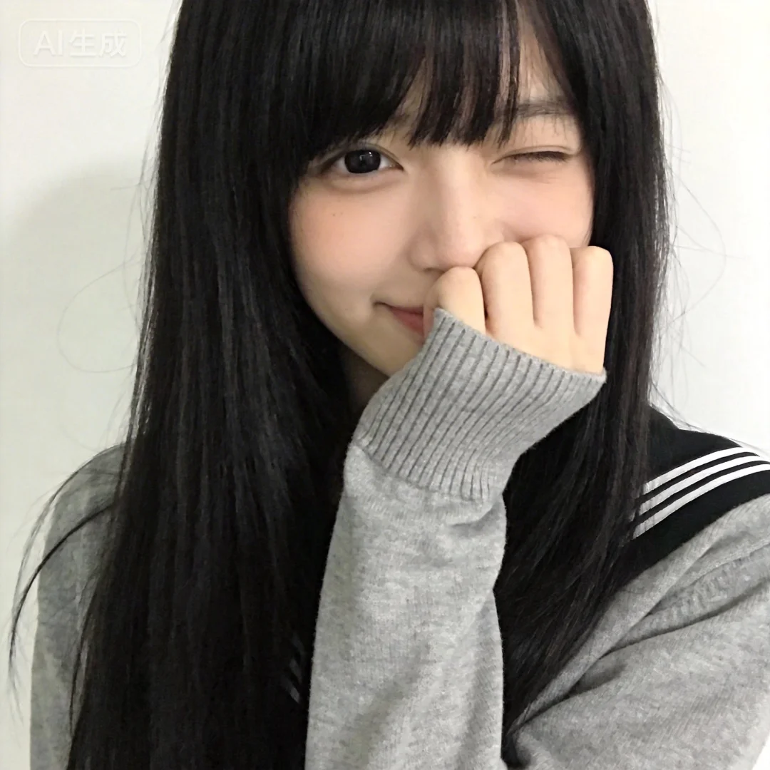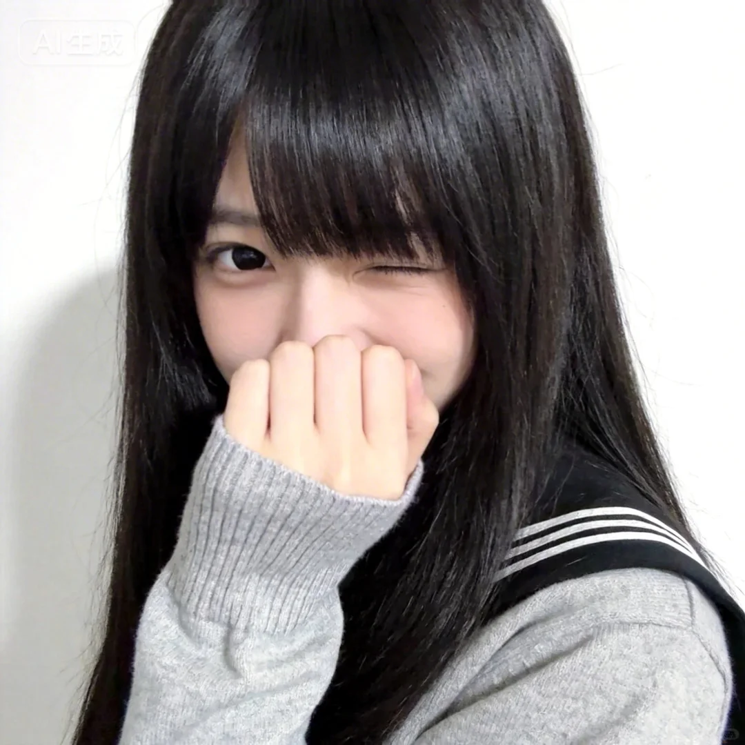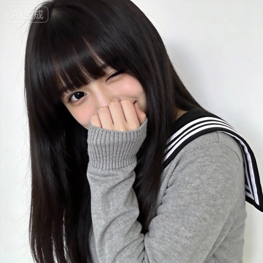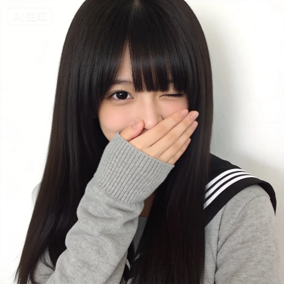 采用清新自然的日系摄影风格,画面主体是一位留着黑长直发型的女生,厚重的齐刘海遮住半只眼睛,顺滑且有光泽的发丝自然垂落在肩头。她身着一件灰色的长袖上衣,袖口是针织罗纹设计,右侧肩头处装饰着黑白相间的条纹,带有些许日系水手服的风格。她左手轻轻捂住嘴巴,只露出一双水润的黑眼睛,眼神里带着怯生生的笑意,温柔又腼腆。背景是干净的白色墙面,柔和的光线打在人物身上,让她的肤色显得白皙细腻,整体画面色调柔和清新,营造出温柔又略带羞涩的氛围感。