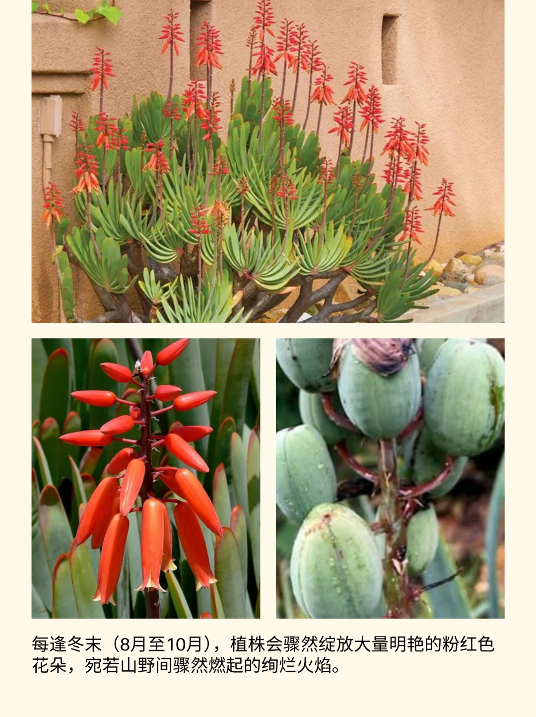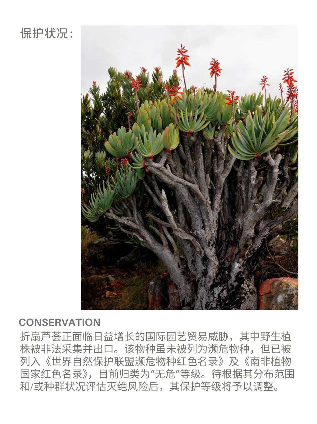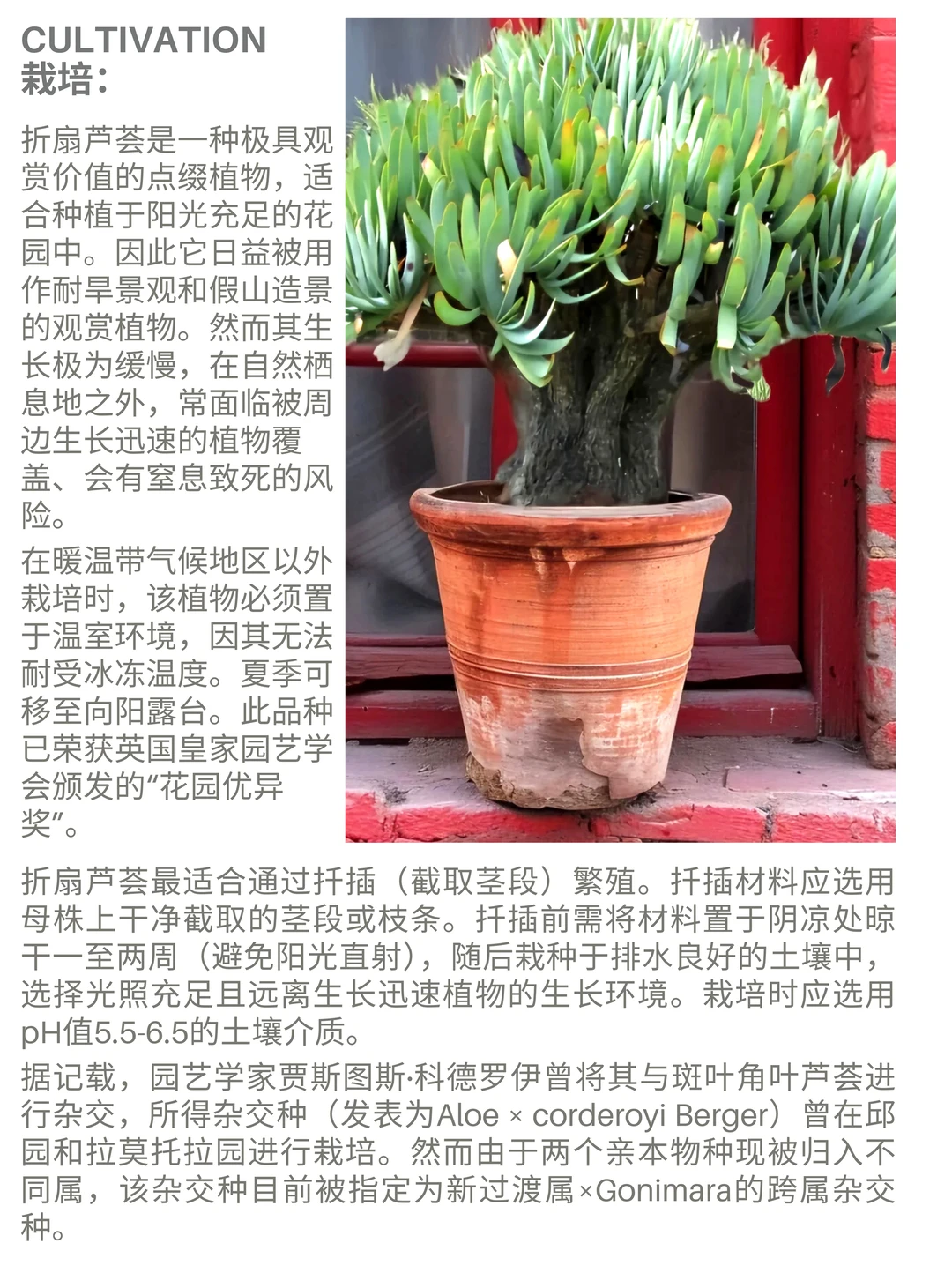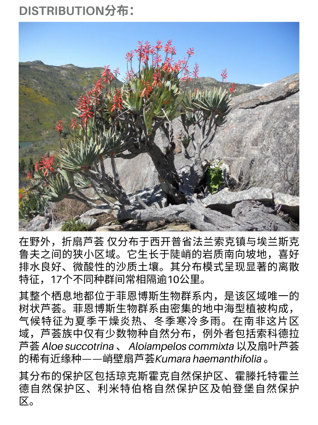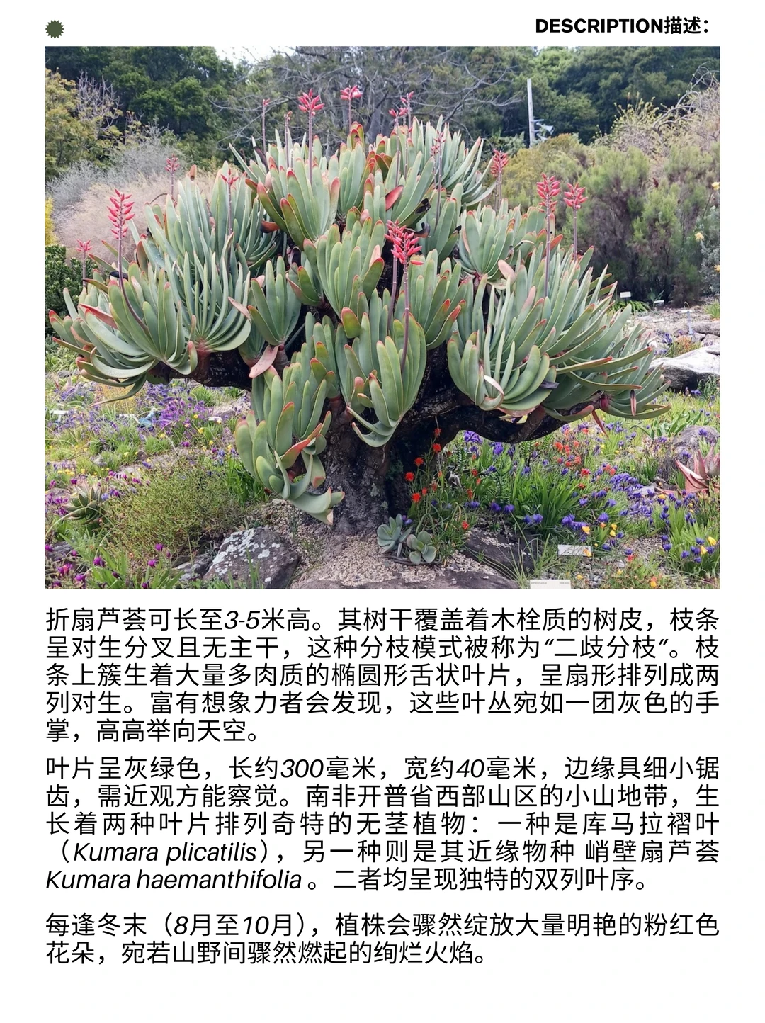 折扇芦荟 Kumara plicatilis 的俗名“扇形芦荟”源于其曾归入芦荟属的分类地位,以及其线形叶片独特的两列排列方式。其拉丁学名plicatilis亦意为“折叠的”、“褶皱的”或“可折叠的”;但无论如何这都是个误称,因其叶片既无褶皱也无法折叠。在当地南非荷兰语中,该植物被称为waaier aalwyn(即“扇形芦荟”)。因其形态酷似 箭袋树 Aloidendron dichotomum,亦被称为kaapse kokerboom(即“开普箭袋树”)。二者相似性主要体现在二歧分枝习性上,但其茎干通常过短,难以用于制作箭袋。折扇芦荟 芦荟 阿福花科 南非 西开普省 Kumara plicatilis