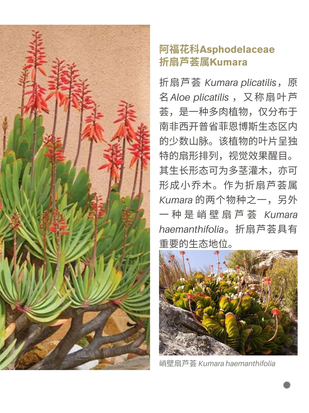 折扇芦荟 Kumara plicatilis,原名Aloe plicatilis ,又称扇叶芦荟,是一种多肉植物,仅分布于南非西开普省菲恩博斯生态区内的少数山脉。该植物的叶片呈独特的扇形排列,视觉效果醒目。其生长形态可为多茎灌木,亦可形成小乔木。作为折扇芦荟属 Kumara 的两个物种之一,另外一种是峭壁扇芦荟 Kumara haemanthifolia。折扇芦荟具有重要的生态地位。