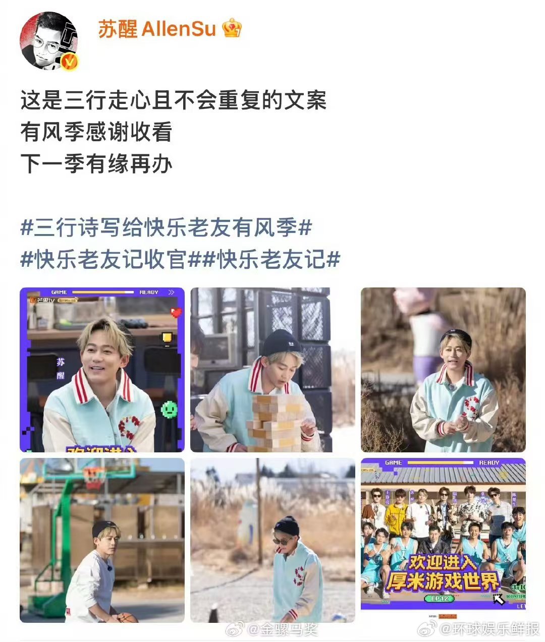 三行诗写给快乐老友有风季快乐老友记收官快乐老友记看到收官横幅的那一刻,所有陪伴与感动涌上心头,节目组太用心,温暖了整个有风季。