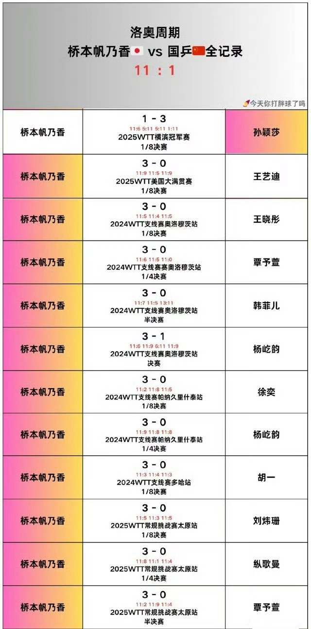 7️⃣2025年横滨冠军赛,孙颖莎3-1终结桥本帆乃香外战41连胜、对国乒11连胜的恐怖战绩,至此打桥本的标准范本出现。