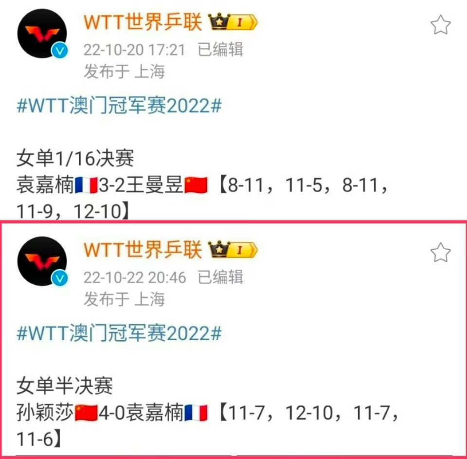 2️⃣2022年澳门冠军赛,王曼昱首轮2-3不敌袁嘉楠,再次一轮游输外协。孙颖莎半决赛4-0零封袁嘉楠,守住半区,最终夺冠。