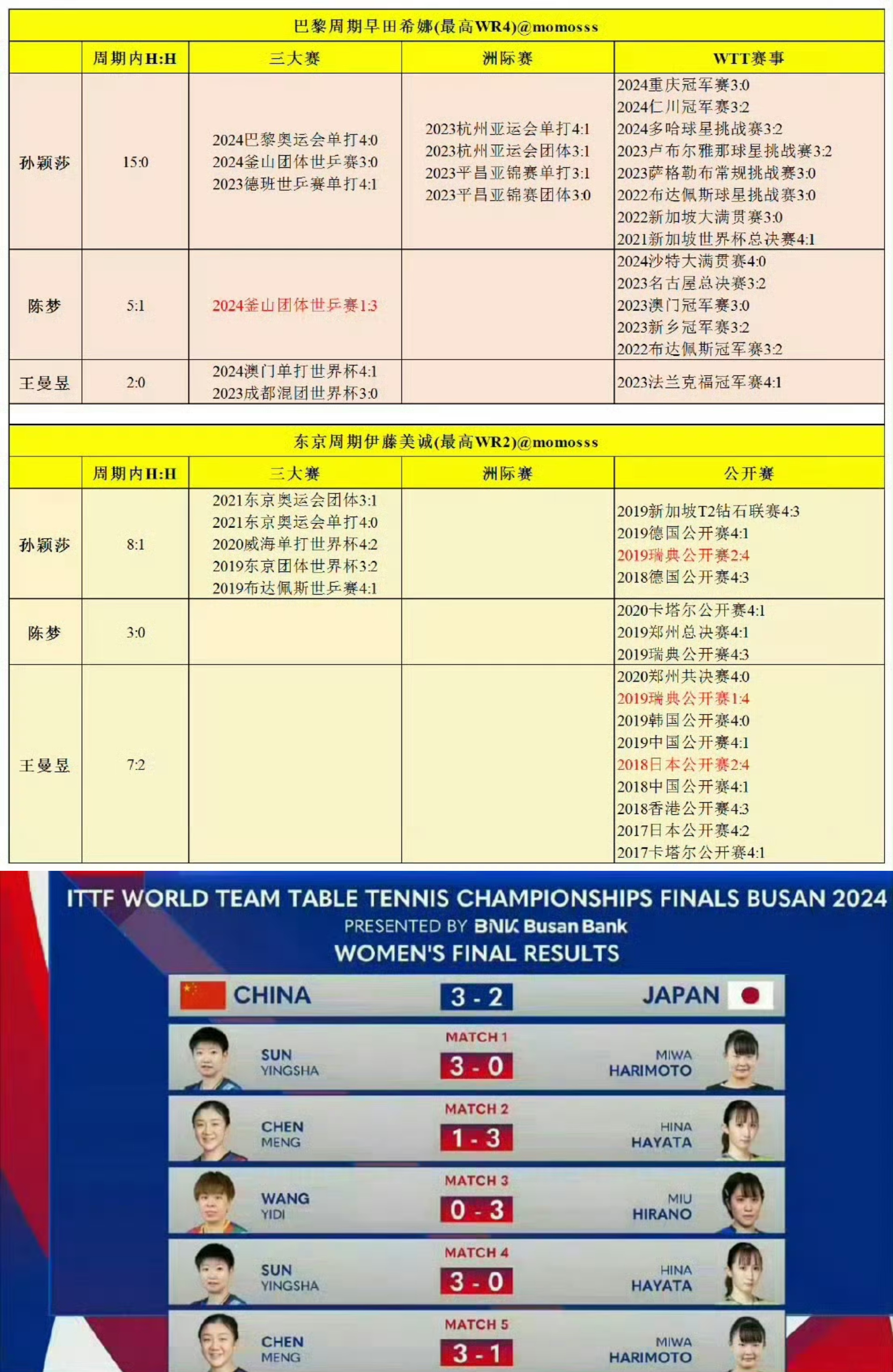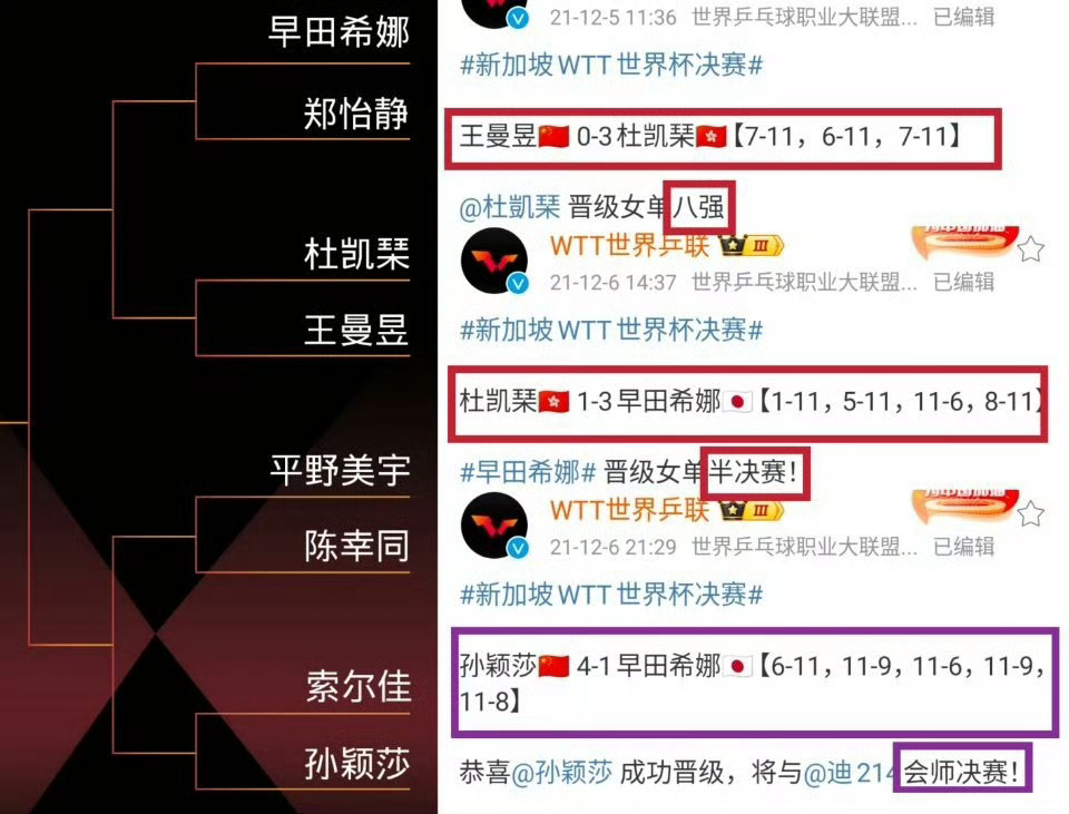 1️⃣2021年年终总决赛,王曼昱与早田希娜同1/4区,首轮0-3不敌杜凯琹,一轮游输外协,放早田进入半决赛。孙颖莎半决赛4-1战胜早田,最终夺冠。从那场开始孙颖莎开启了巴黎周期对最强外协早田希娜的15连胜。
