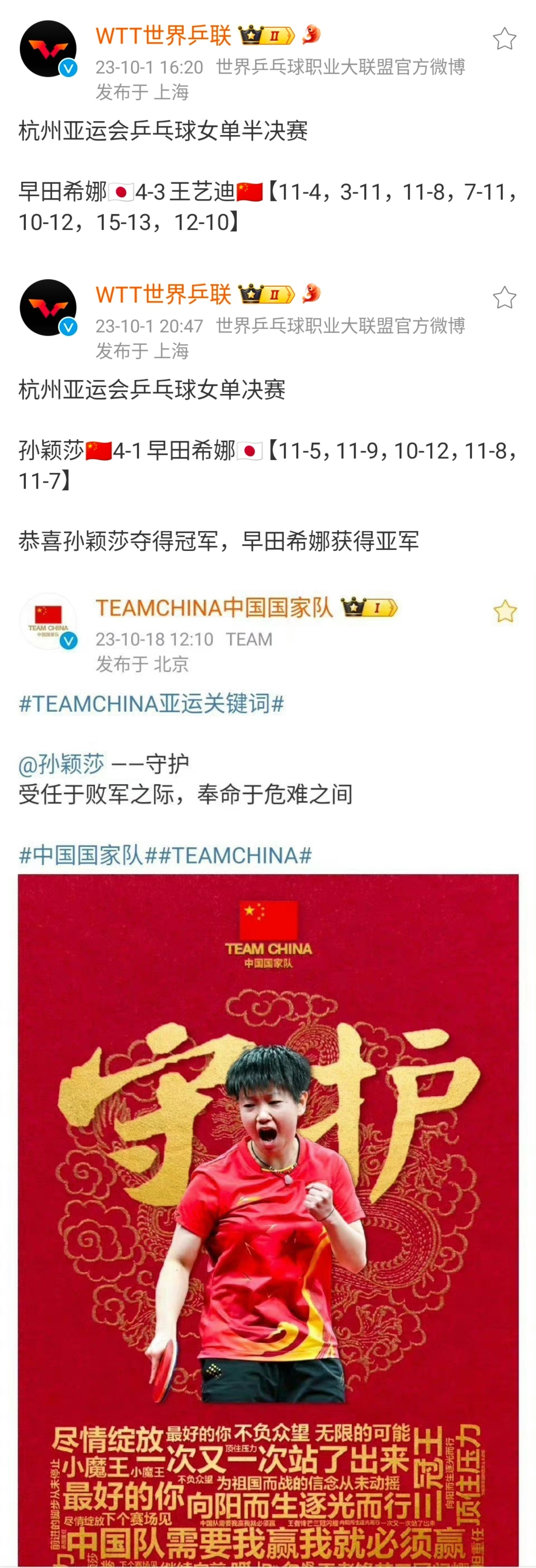 4️⃣2023年杭州亚运会,半决赛王艺迪3-4再负早田,国庆节当天决赛场上孙颖莎成功狙击日本选手早田希娜,拿下女单冠军守住全区。10.1日那天国歌因孙颖莎在主场响起。