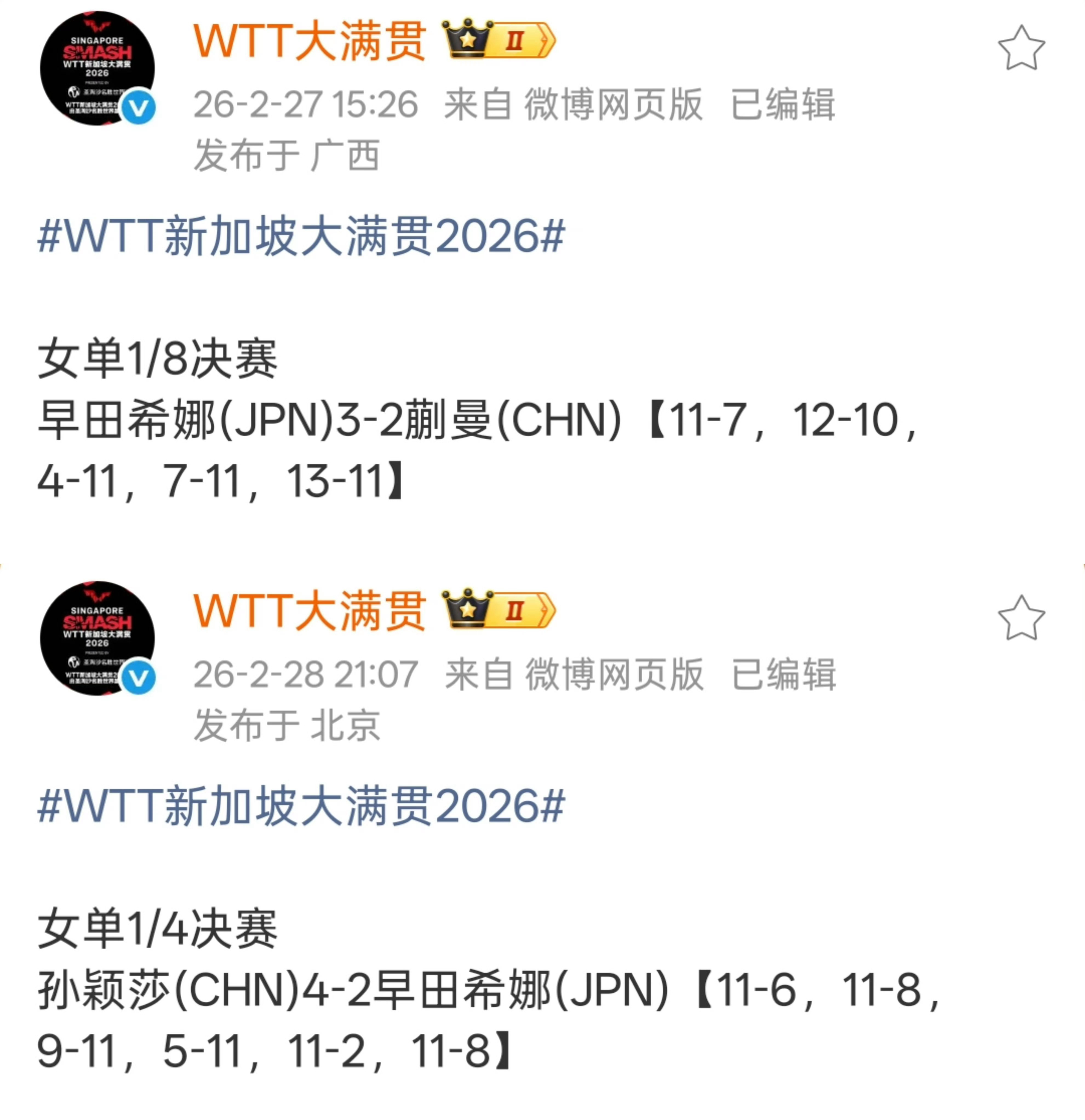 8️⃣2026年新加坡大满贯,蒯曼2-3负于早田希娜。孙颖莎4-2早田,再次为队友兜底。