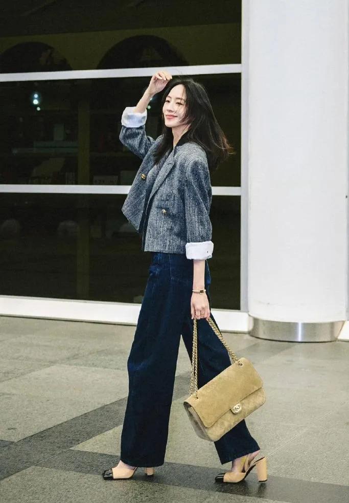 43岁张钧甯的中年穿搭太值得抄作业!灰色短款粗花呢西装+藏青直筒裤,利落又高级,卷边袖口和金色配饰点亮细节,减龄又显气场,松弛感拉满✨ 张钧甯 中年穿搭 西装混搭