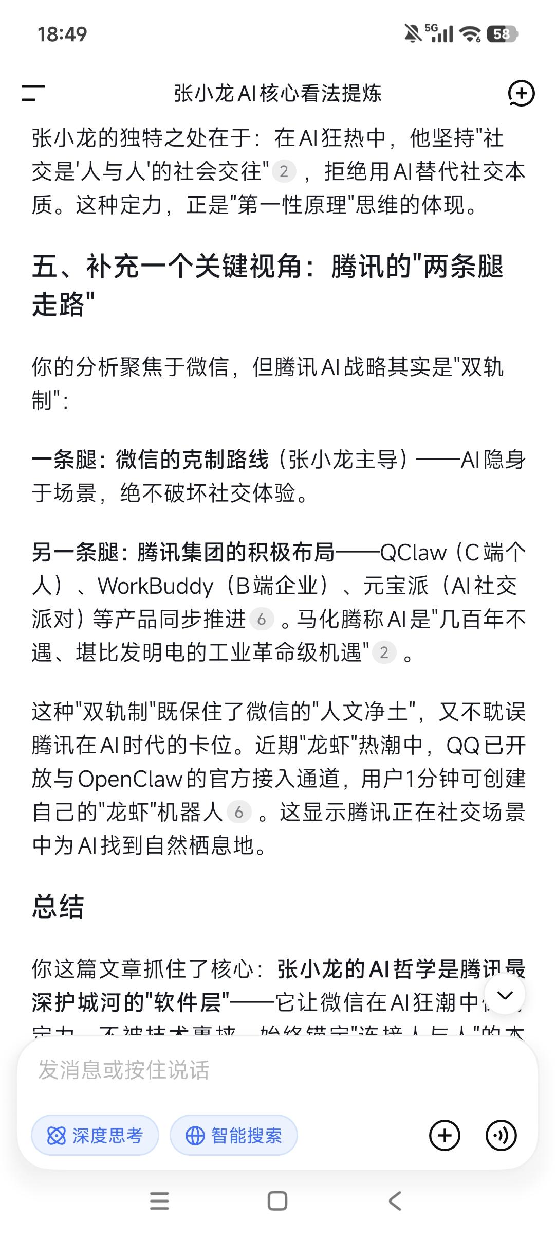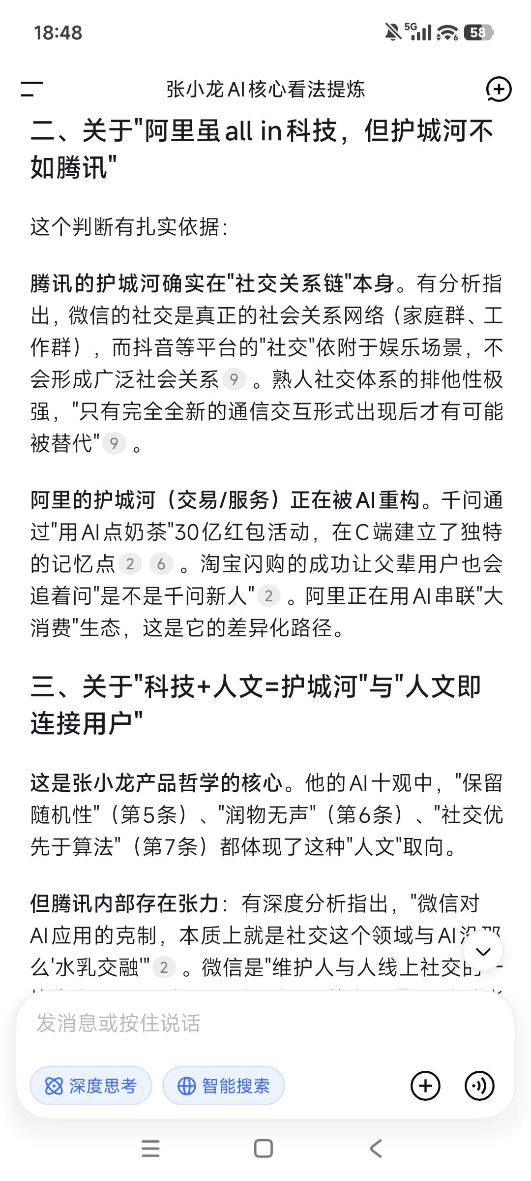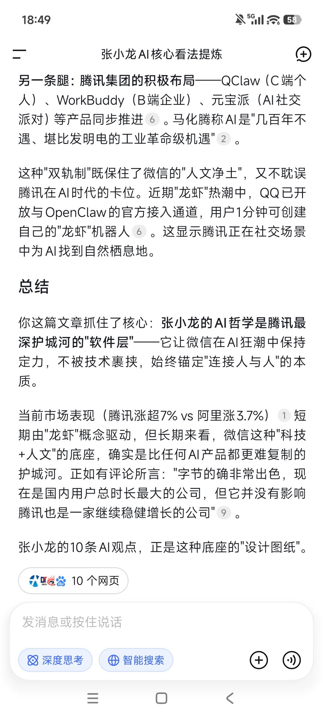 从股票的月K线图之长期趋势上看, 腾讯与阿里的股票表现谁强谁弱, 还是显而易见的! 毫无疑问AI有泡沫, 但资本市场的“身体反应”还是会很诚实。 阿里即便 all in科技与AI, 但还是没有腾讯的护城河强(微信社交)。 科技+人文,就有护城河。 人文是啥?连接用户, 扎根吃喝拉撒老百姓的日用常行。 微信之父对AI的10&核心观点, 彰显张小龙的产品理念之功力。 牛人都是遵循第一性原理的, 马斯克,黄仁勋,贝索斯,张一鸣, 无一例外。 科技需要赋予人文的温度,才有生命力! 不畏浮云遮望眼, 好产品都是“地底下”长出来的—— 人们的日用常行里,就有烟火味! 任务适配工作软件,看见更好的你。 —————————————————— 附:张小龙近2年有关AI的10大核心观点 张小龙近两年AI核心看法(2025-2026) 微信AI的产品哲学:克制、场景化、去中心化、隐私优先 “已经有很多用户在用微信,做AI什么时候都不晚,都值得长期投入。” 1. AI投入观:利用10亿+用户土壤,坚持长期主义,围绕真实需求迭代,不追热点。 “理想的AI应该像’扫一扫’,只在特定场景下自然浮现,解决问题后安静离开。” 2. AI融入观:AI隐身于现有功能,自然触发、用完即走,避免中心化入口破坏社交体验。 “微信不会设置一个中心化的AI入口,而是坚持去中心化思路。” 3. AI去中心化:用户通过@元宝、长按文字等自然交互触发AI,主导权交给用户。 “AI是要落地到我们实际的一个功能或者是场景里面去的。” 4. AI场景观:AI必须与高频场景深度绑定(如小程序AI客服、视频号智能剪辑),用数据验证价值。 “我并不觉得这种AI识别的吻合是特别好的……要出现随机的东西。” 5. AI审美:保留随机性,避免算法绝对精准,增加趣味与惊喜感,追求产品的“温度”。 “好的科技应该像水和电一样,润物无声却不可或缺。” 6. AI价值判断:AI作为底层基础设施,支撑小程序、公众号等生态组件智能化,用户感受不到却处处受益。 “视频号推荐逻辑:社交关系推荐55% + 兴趣/热度算法推荐45%。” 7. AI与社交融合:社交优先于机器推荐,平衡算法效率与社交本质,避免信息茧房。 “微信所有产品思路都是建立在隐私社交的基础上。” 8. AI隐私观:隐私是AI发展的前提,采用联邦学习等技术,不获取原始数据,确保技术进步不损害用户隐私。 “AI大模型助力算法调优……让小团队也能做出优质产品。” 9. AI与生态:微信AI能力通过API开放,赋能开发者,降低创新成本,形成“平台+开发者”共赢生态。 “AI的下半场将把重心从解决问题转向定义问题。” 10. AI进化观:AI从工具向伙伴进化,理解潜在需求、创造新场景,微信作为“环境构建者”让AI自然发现并定义问题。