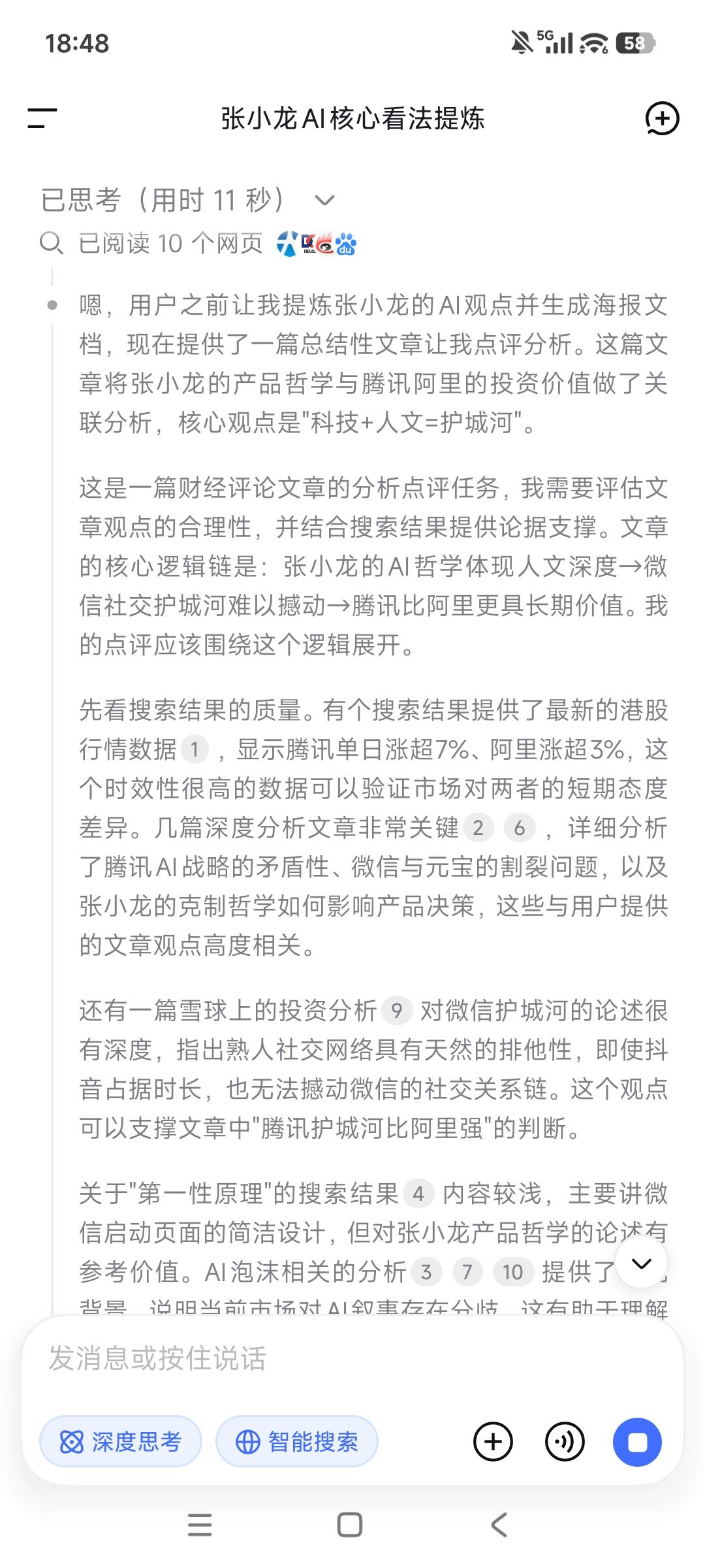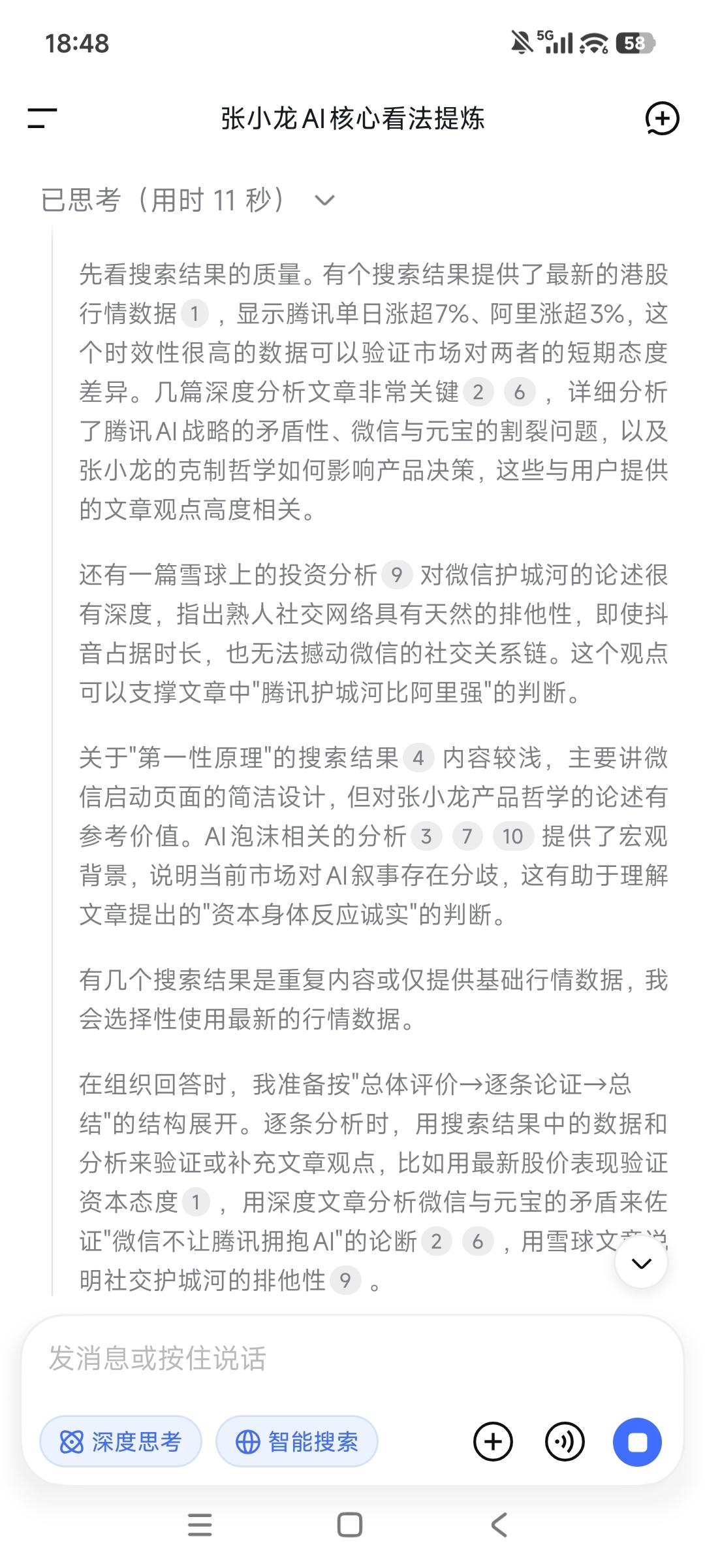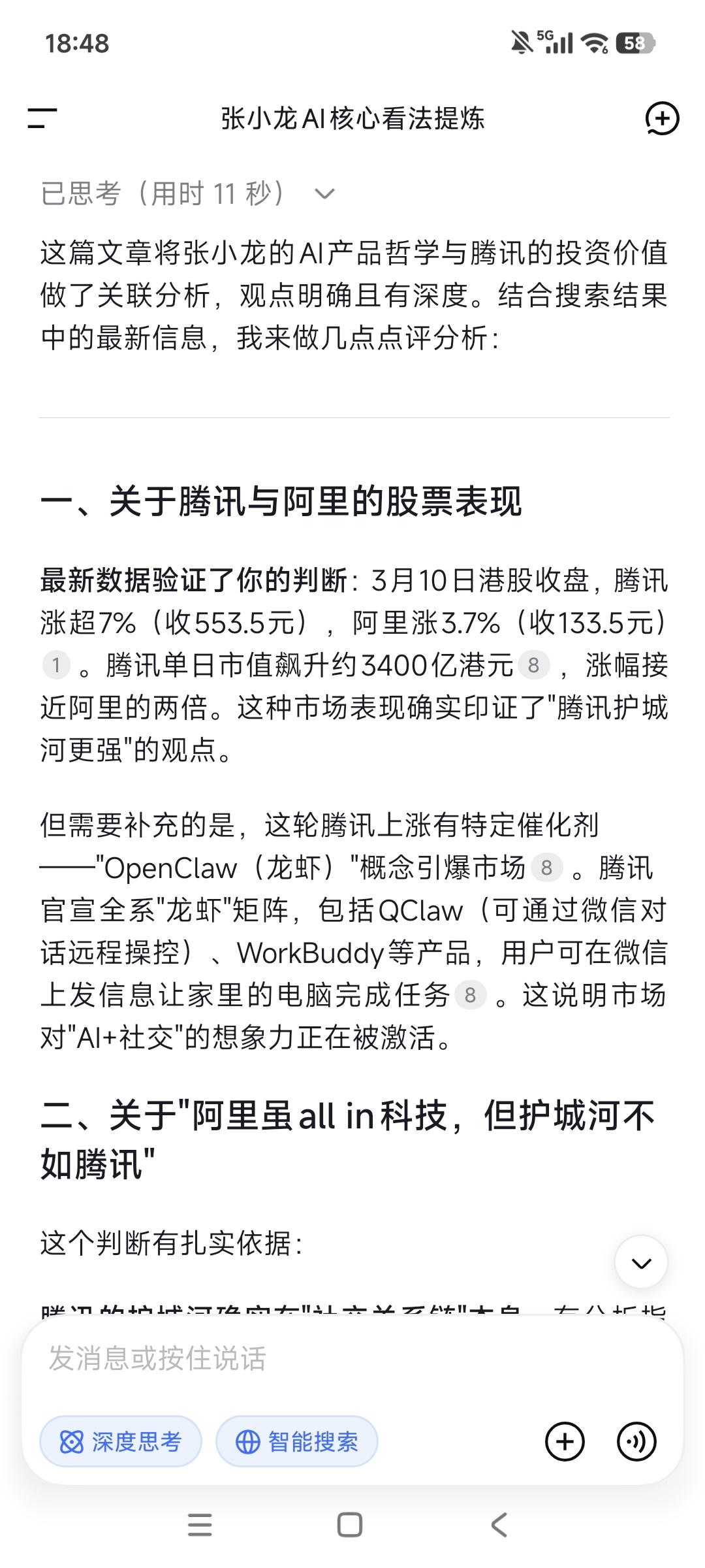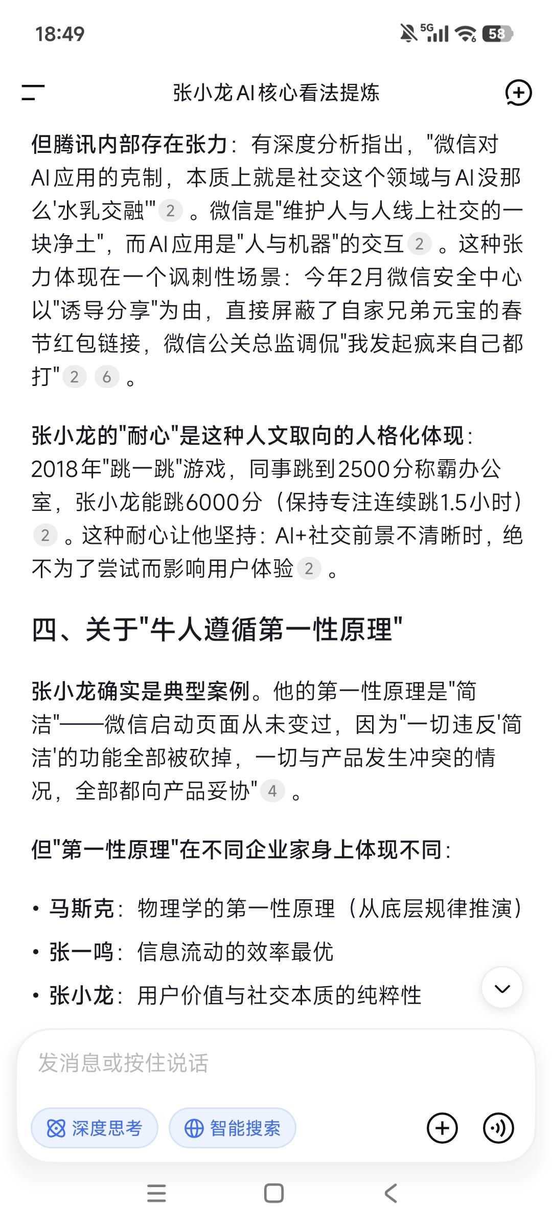 从股票的月K线图之长期趋势上看, 腾讯与阿里的股票表现谁强谁弱, 还是显而易见的! 毫无疑问AI有泡沫, 但资本市场的“身体反应”还是会很诚实。 阿里即便 all in科技与AI, 但还是没有腾讯的护城河强(微信社交)。 科技+人文,就有护城河。 人文是啥?连接用户, 扎根吃喝拉撒老百姓的日用常行。 微信之父对AI的10&核心观点, 彰显张小龙的产品理念之功力。 牛人都是遵循第一性原理的, 马斯克,黄仁勋,贝索斯,张一鸣, 无一例外。 科技需要赋予人文的温度,才有生命力! 不畏浮云遮望眼, 好产品都是“地底下”长出来的—— 人们的日用常行里,就有烟火味! 任务适配工作软件,看见更好的你。 —————————————————— 附:张小龙近2年有关AI的10大核心观点 张小龙近两年AI核心看法(2025-2026) 微信AI的产品哲学:克制、场景化、去中心化、隐私优先 “已经有很多用户在用微信,做AI什么时候都不晚,都值得长期投入。” 1. AI投入观:利用10亿+用户土壤,坚持长期主义,围绕真实需求迭代,不追热点。 “理想的AI应该像’扫一扫’,只在特定场景下自然浮现,解决问题后安静离开。” 2. AI融入观:AI隐身于现有功能,自然触发、用完即走,避免中心化入口破坏社交体验。 “微信不会设置一个中心化的AI入口,而是坚持去中心化思路。” 3. AI去中心化:用户通过@元宝、长按文字等自然交互触发AI,主导权交给用户。 “AI是要落地到我们实际的一个功能或者是场景里面去的。” 4. AI场景观:AI必须与高频场景深度绑定(如小程序AI客服、视频号智能剪辑),用数据验证价值。 “我并不觉得这种AI识别的吻合是特别好的……要出现随机的东西。” 5. AI审美:保留随机性,避免算法绝对精准,增加趣味与惊喜感,追求产品的“温度”。 “好的科技应该像水和电一样,润物无声却不可或缺。” 6. AI价值判断:AI作为底层基础设施,支撑小程序、公众号等生态组件智能化,用户感受不到却处处受益。 “视频号推荐逻辑:社交关系推荐55% + 兴趣/热度算法推荐45%。” 7. AI与社交融合:社交优先于机器推荐,平衡算法效率与社交本质,避免信息茧房。 “微信所有产品思路都是建立在隐私社交的基础上。” 8. AI隐私观:隐私是AI发展的前提,采用联邦学习等技术,不获取原始数据,确保技术进步不损害用户隐私。 “AI大模型助力算法调优……让小团队也能做出优质产品。” 9. AI与生态:微信AI能力通过API开放,赋能开发者,降低创新成本,形成“平台+开发者”共赢生态。 “AI的下半场将把重心从解决问题转向定义问题。” 10. AI进化观:AI从工具向伙伴进化,理解潜在需求、创造新场景,微信作为“环境构建者”让AI自然发现并定义问题。