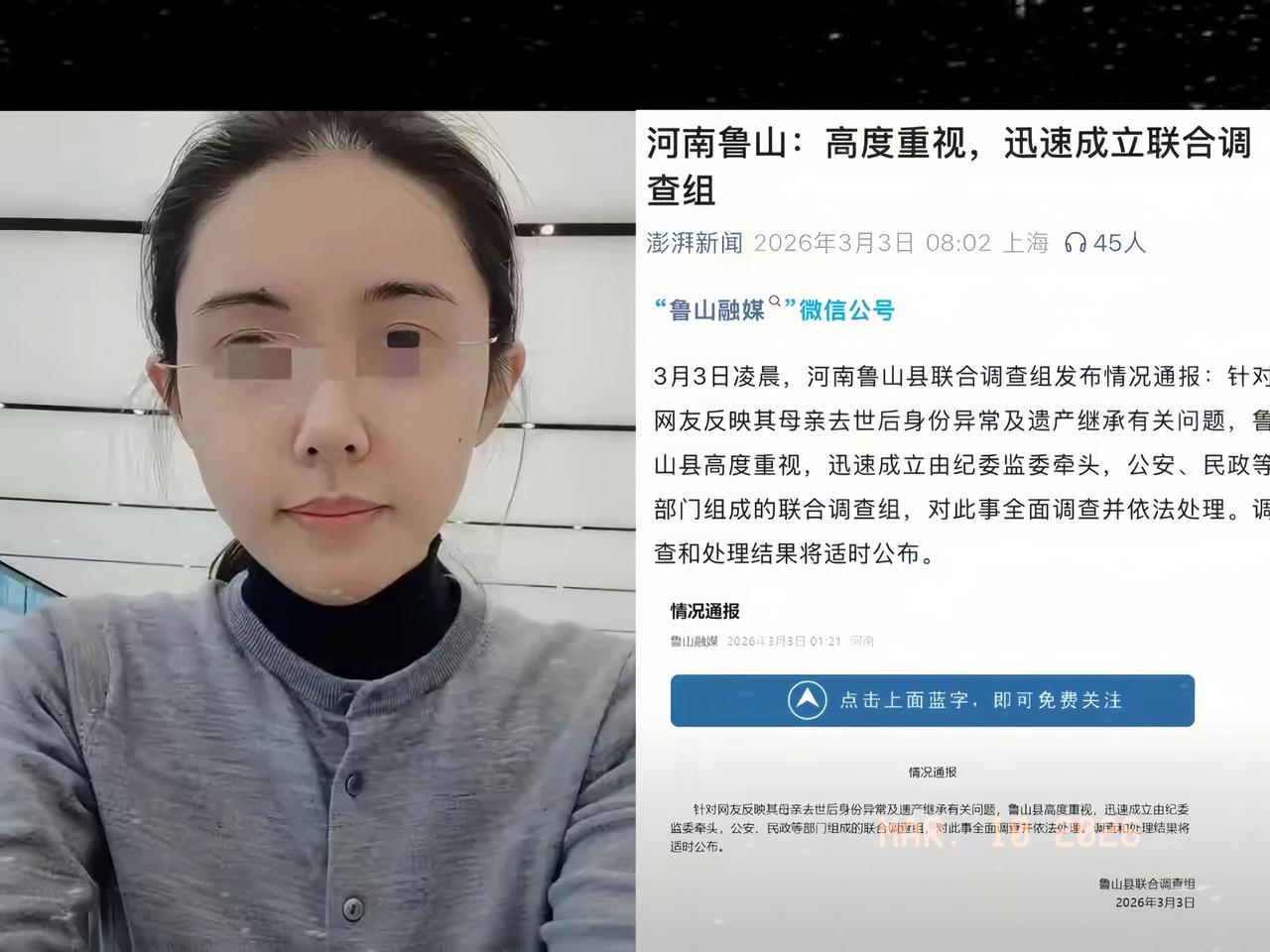 鲁山孙艺菲维权案升级! 鲁山舅舅想私了被直接拒绝! 市里已经立案调查,那些想“吃绝户”的人,一个都别想跑! 河南鲁山,孙艺菲的维权之路再次引发关注。她的母亲赵芳于2008年12月3日离世,生前经营珠宝生意,留下可观家底。 然而母亲去世后不久,其名下房产便被小姨冒用名义偷偷出售。更令人震惊的是,2009年孙艺菲发现,亲戚竟伪造了母亲的结婚登记照片是母亲的,配偶却不是她的生父。直到2018年她去公证处核查遗产,才得知母亲被捏造了“再婚”事实。 2025年12月,孙艺菲将此事公之于众,直言多年来以为母亲未留遗产,查实后正与亲戚争夺财产,瞬间引爆舆论。 3月3日鲁山县成立调查组,孙艺菲坚持要求市级介入,3月9日案件由市级调查组正式接手。 面对亲戚试图私下和解的请求,孙艺菲坚决拒绝,誓言追究到底。如今案件已立案侦查,相关人员难逃法律追责。 这场遗产争夺案,最终会给涉事者怎样的定论?孙艺菲能否顺利为母亲讨回公道?