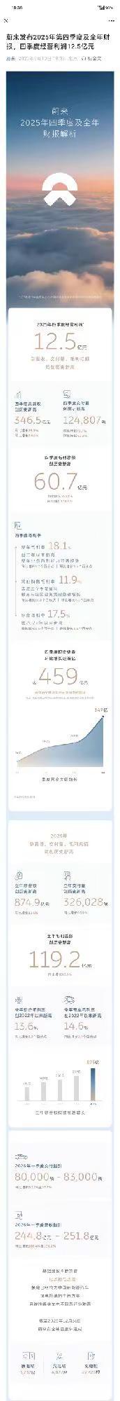 蔚来四季度盈利财报来了,这一刻等了11年。声明,通过长截图,利用oppo一键闪记整理以下正文这是蔚来发布的2025年第四季度及全年财报解析,包含了经营利润、营收、交付量、毛利率、现金储备以及基础建设等方面的详细数据。📊 2025年第四季度核心数据经营利润:12.5亿元,总营收、交付量、毛利总额均创历史新高总营收:346.5亿元,同比增长75.9%,环比增长59.0%交付量:124,807辆,同比增长71.7%,环比增长43.3%毛利总额:60.7亿元,同比增长163.1%,环比增长100.8%毛利率:整车毛利率:18.1%,创三年以来新高,同比增长5.0个百分点,环比增长3.4个百分点其他销售毛利率:11.9%,连续三个季度盈利,同比增长10.8个百分点,环比增长4.1个百分点综合毛利率:17.5%,创2022年以来新高,同比增长5.8个百分点,环比增长3.6个百分点现金储备:459亿元,环比增长近百亿,连续两个季度实现正向自由现金流(包含现金及现金等价物、受限制现金、短期投资及长期定期存款)📈 2025年全年核心数据总营收:874.9亿元,同比增长33.1%,创历史新高交付量:326,028辆,同比增长46.9%,创历史新高毛利总额:119.2亿元,同比增长83.5%,创历史新高毛利率:综合毛利率:13.6%,创2022年以来新高,同比增长3.7个百分点整车毛利率:14.6%,创2022年以来新高,同比增长2.3个百分点🔮 2026年一季度指引交付指引:80,000辆 - 83,000辆,同比增长90.1%至97.2%营收指引:244.8亿元 - 251.8亿元,同比增长103.4%至109.2%🏗️ 基础建设成果换电成果:一亿次换电达成,换电成为中国新能源汽车加电补能主流方案,系统性解决车电不同寿行业难题截至2025年12月31日建设情况:换电站:3,737座充电站:4,877座充电桩:27,728根