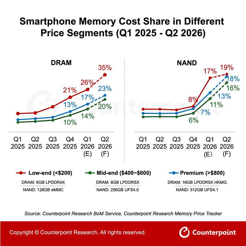 Counterpoint Research 发布了题为《智能手机的 BoM 结构将如何随着内存价格飙升而发生变化》的报告。2026 年第一季度 DRAM 环比上涨超过 50%,NAND 闪存环比上涨超过 90%。一句话就是,2026年零售价上涨不可避免,成本上升将转嫁给消费者。